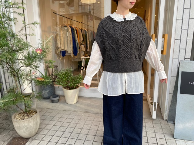 南米ペルーの標高3800メートルのチチカカ湖の ほとりにあるPUNO(プーノ)という街の集落で 棒針で編まれたハンドアランニットカシュクール です。 柔らかな肌触りの手紡ぎのアルパカ混糸を使用し オリジナルのアラン柄で編み上げられています。 リンギングなど機械を一切使用せず 全て手作業です。 前立てがケーブル柄になっているのも ポイントです。 カシュクール部分はゆるりと たらしたり、ぎゅっと結んだり お好みで 前後逆にしても楽しめます。 ※全て手作業で作られているため 多少のサイズのばらつきがか出る場合が ございます サイズ 着丈55センチ 幅108センチ 肩48センチ 袖52センチ made in Peru H0-00-1002 heriter 着用スタッフ162センチ