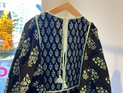 大胆なモチーフ使いの3柄をミックスし、胸元をカラーパイピングで切り替えたデザインは、〈neQuittezpas〉らしい色彩センスが際立つ一枚。