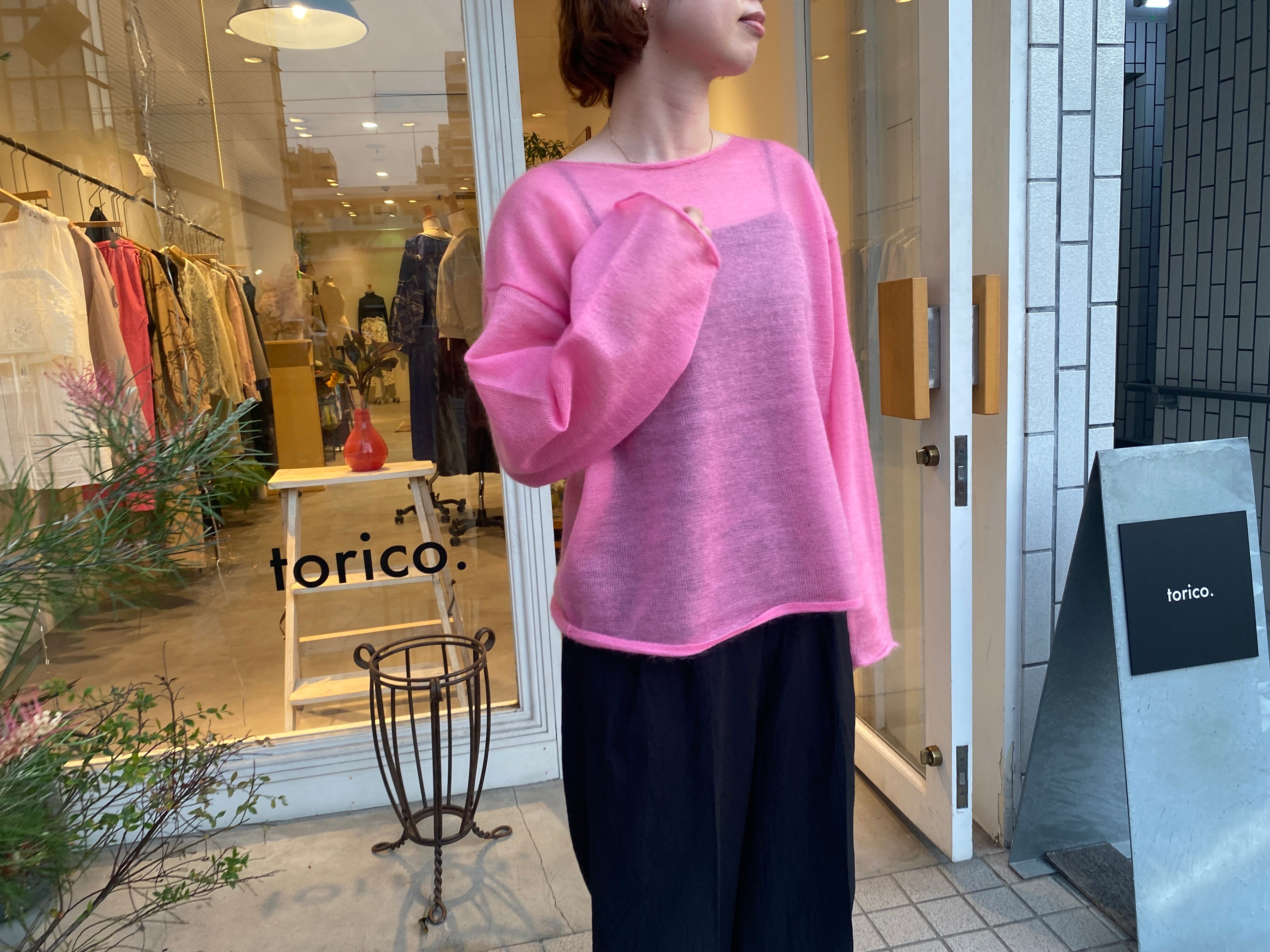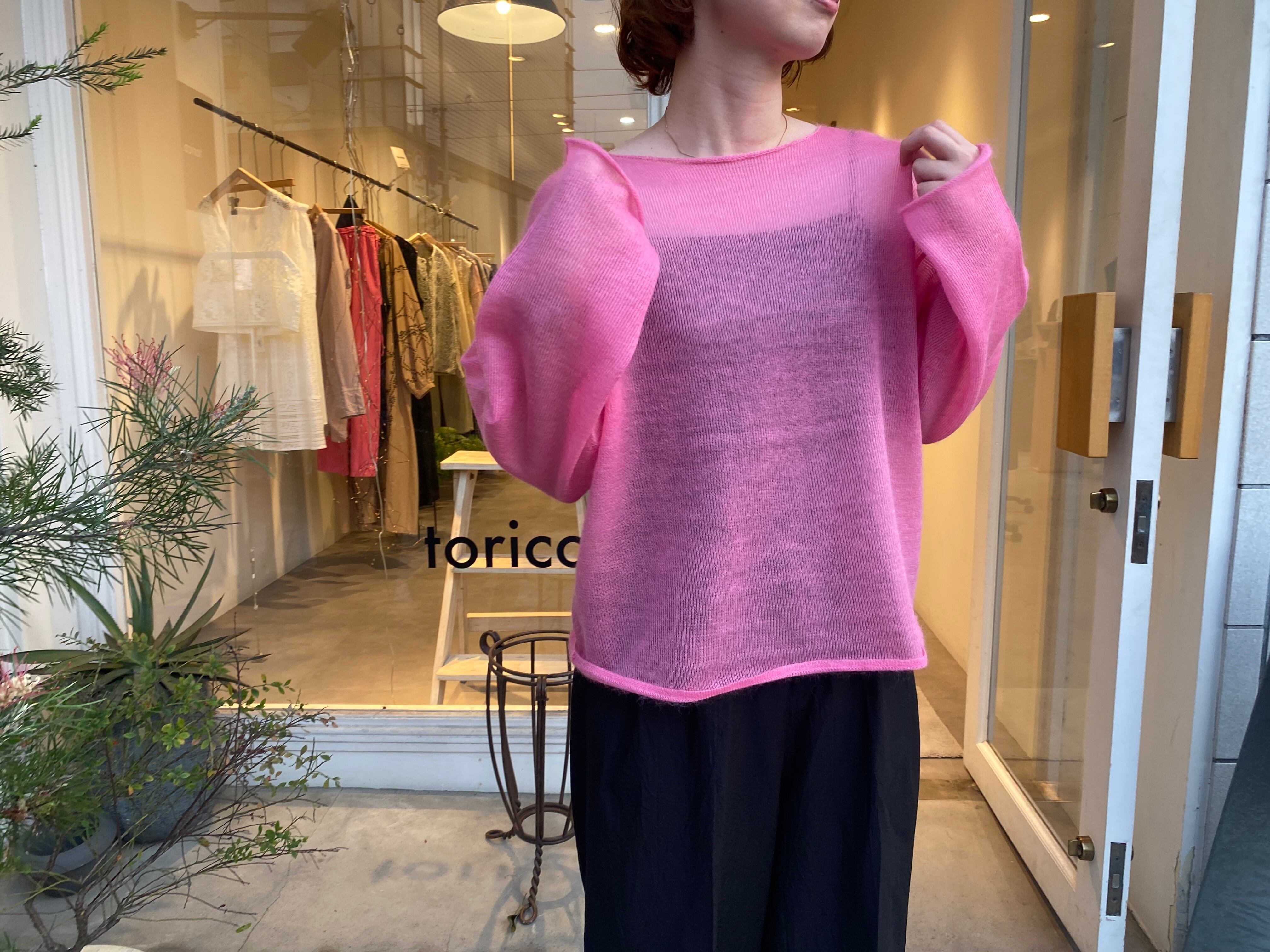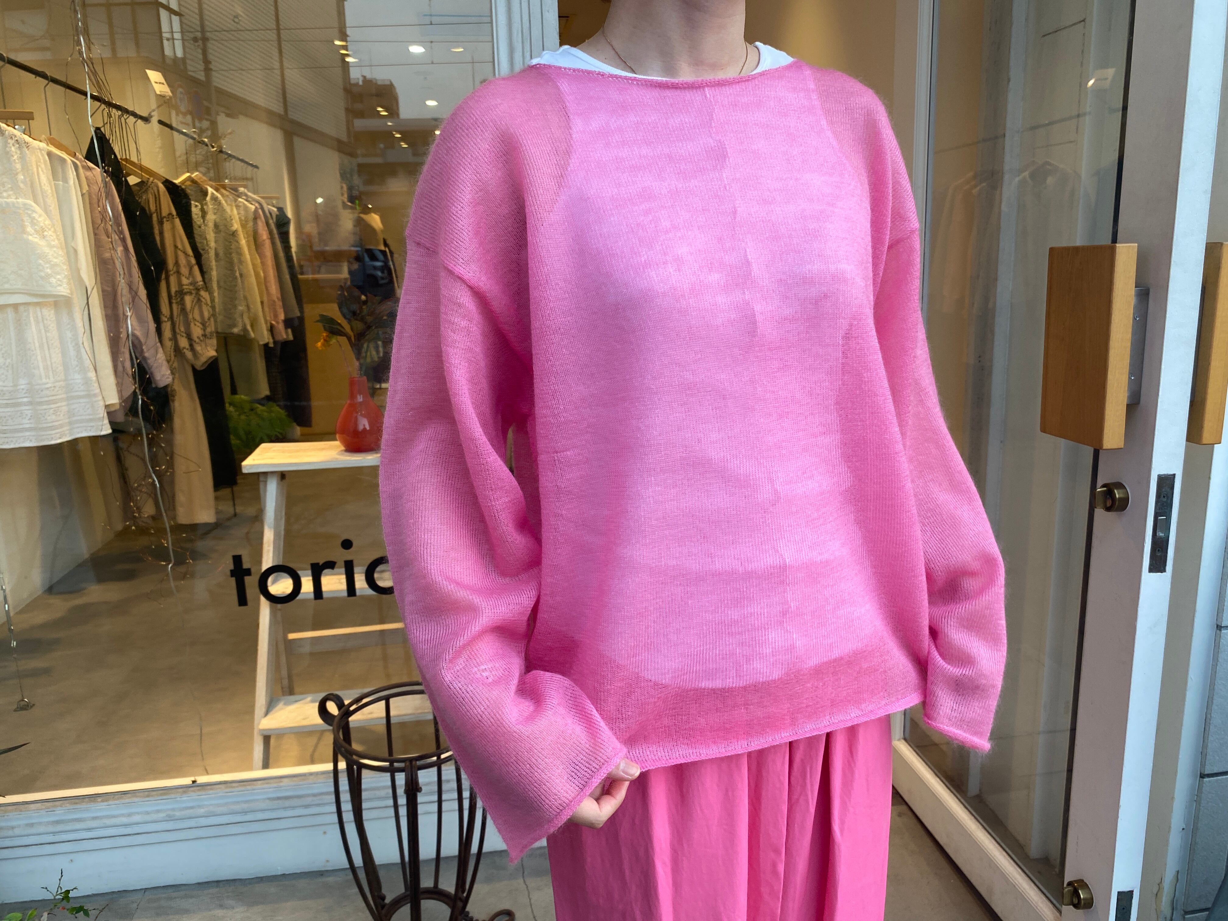 極細のスーパーキッドモヘアとハリ感ある極細ナイロンを引き揃えたシアーニット。