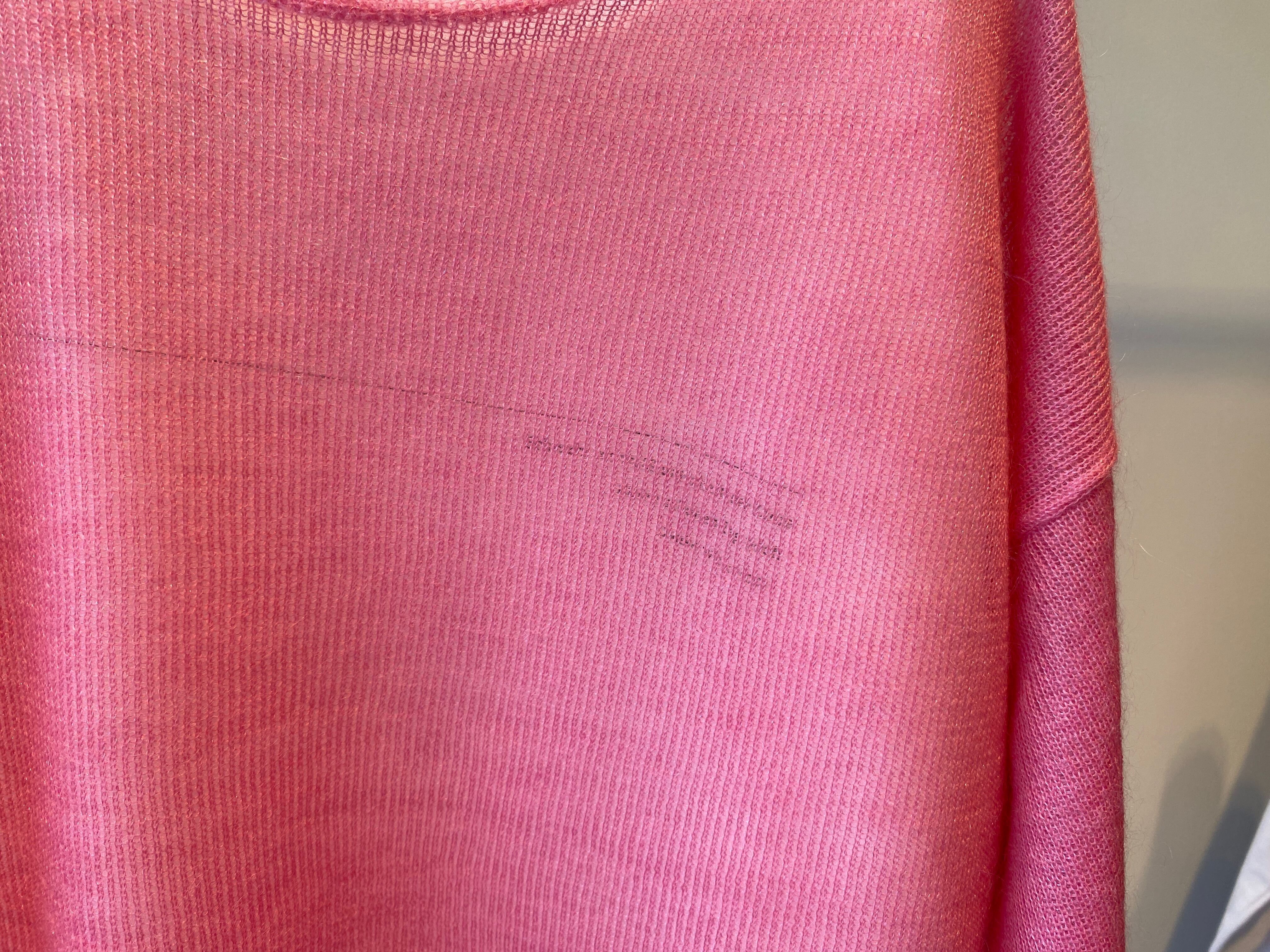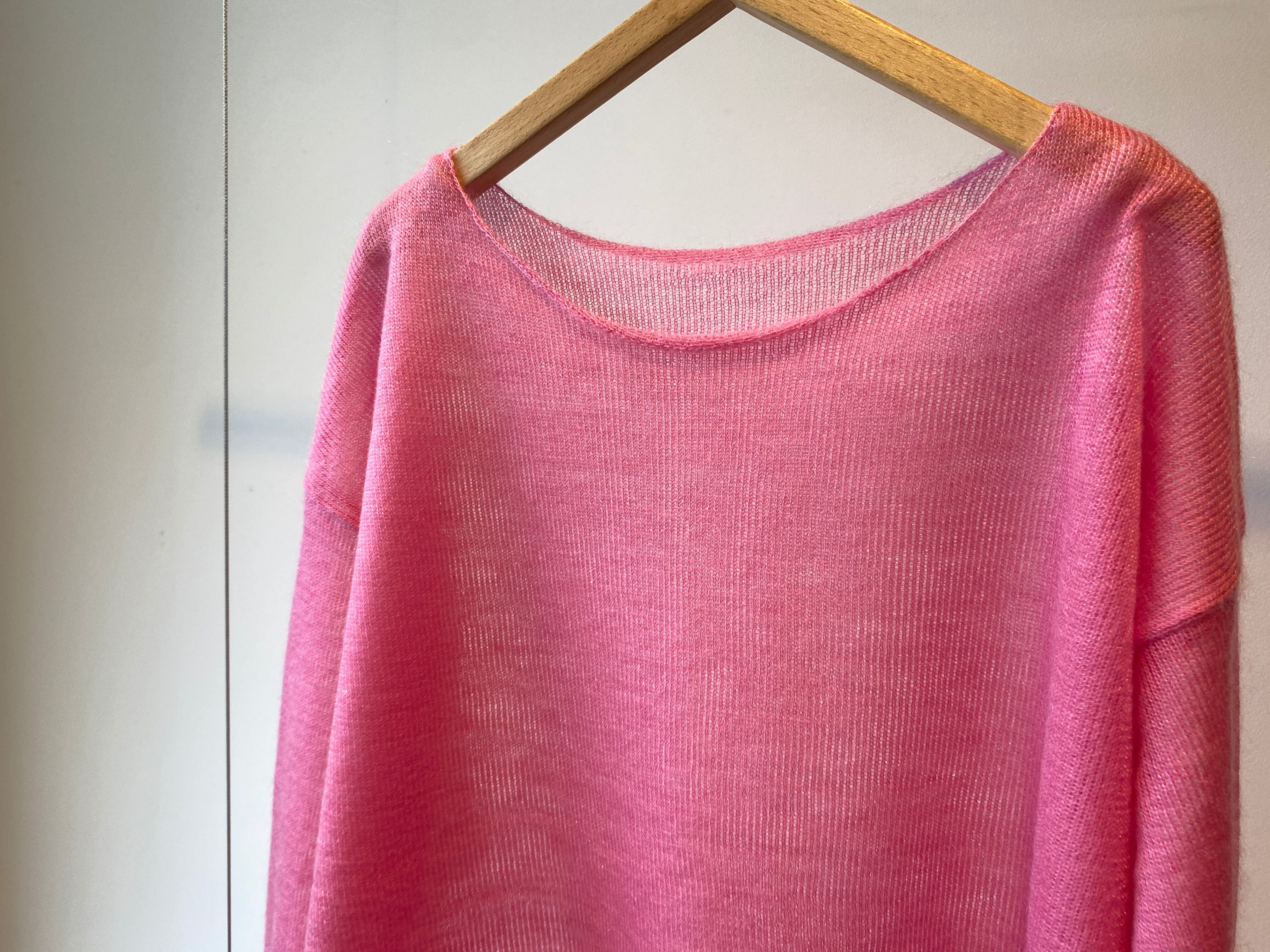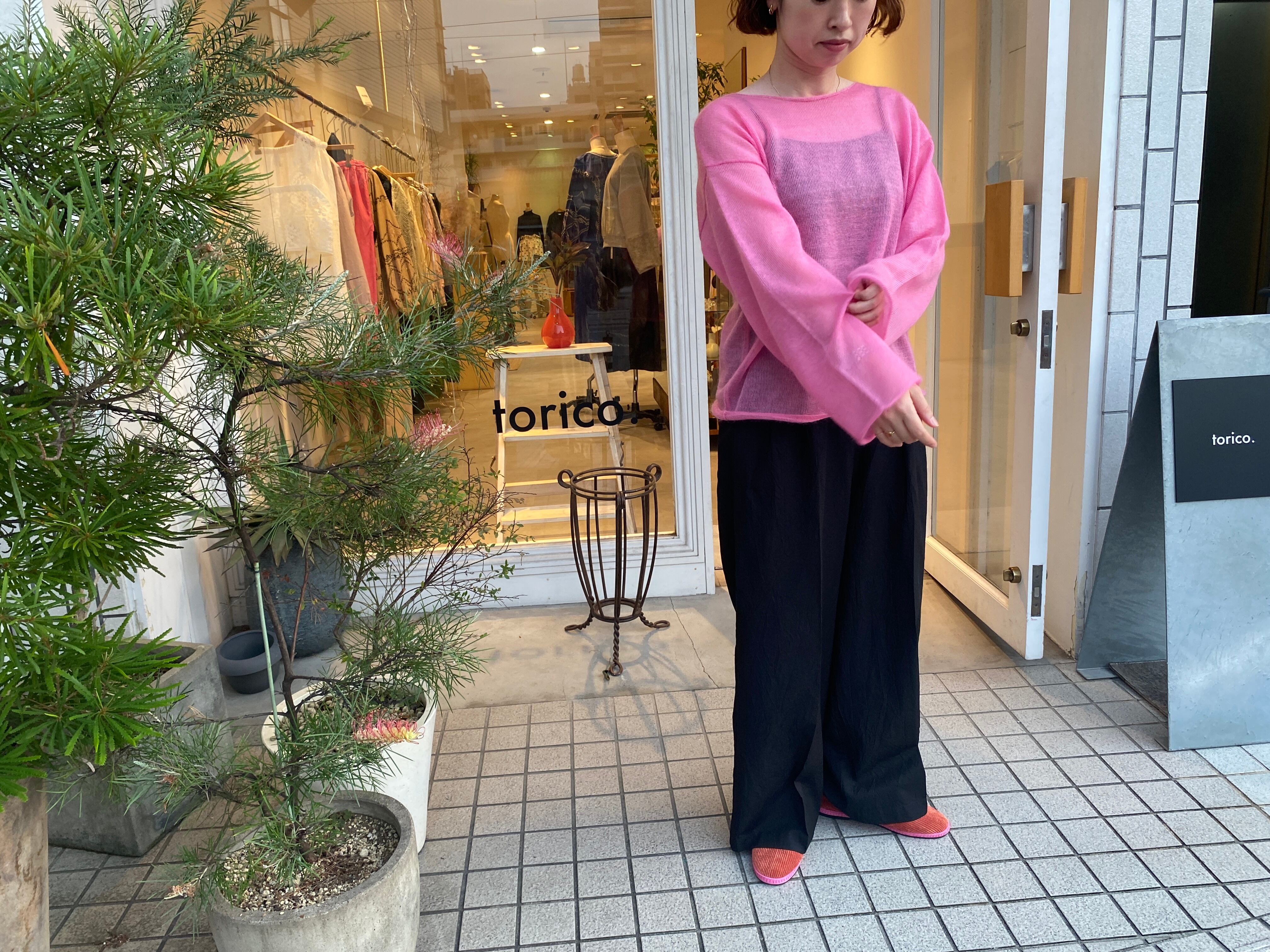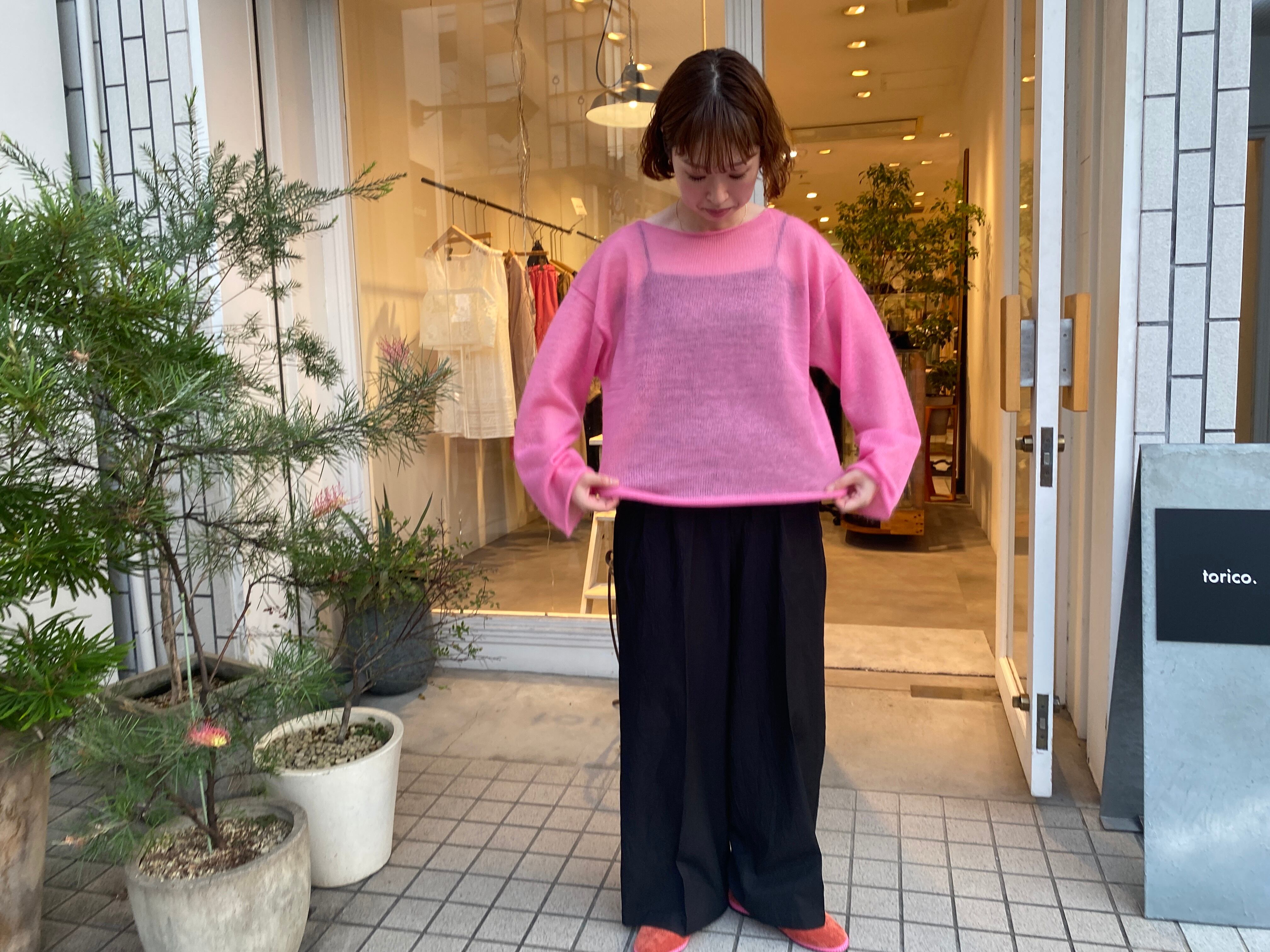 極細のスーパーキッドモヘアとハリ感ある極細ナイロンを引き揃えたシアーニット。
