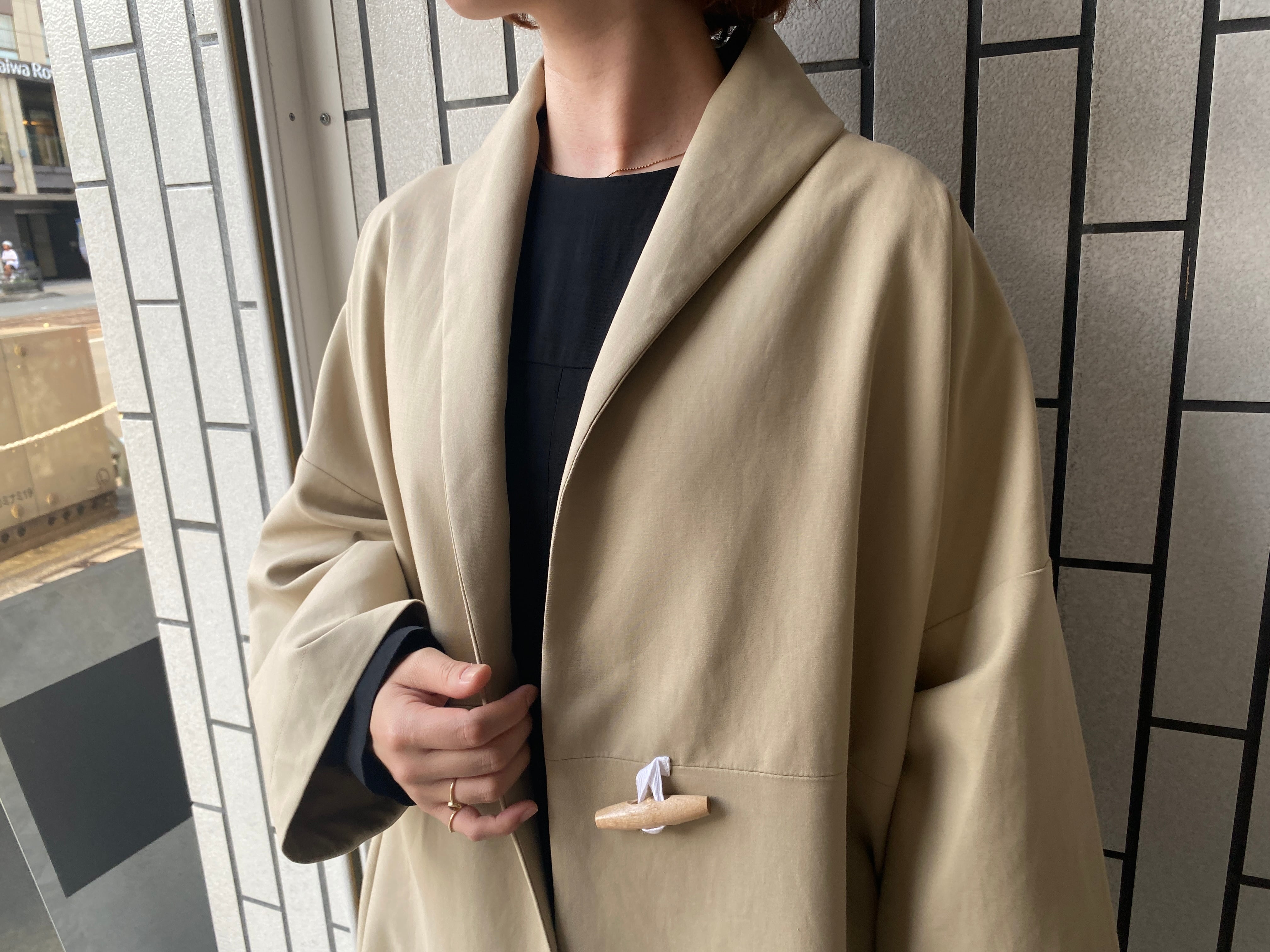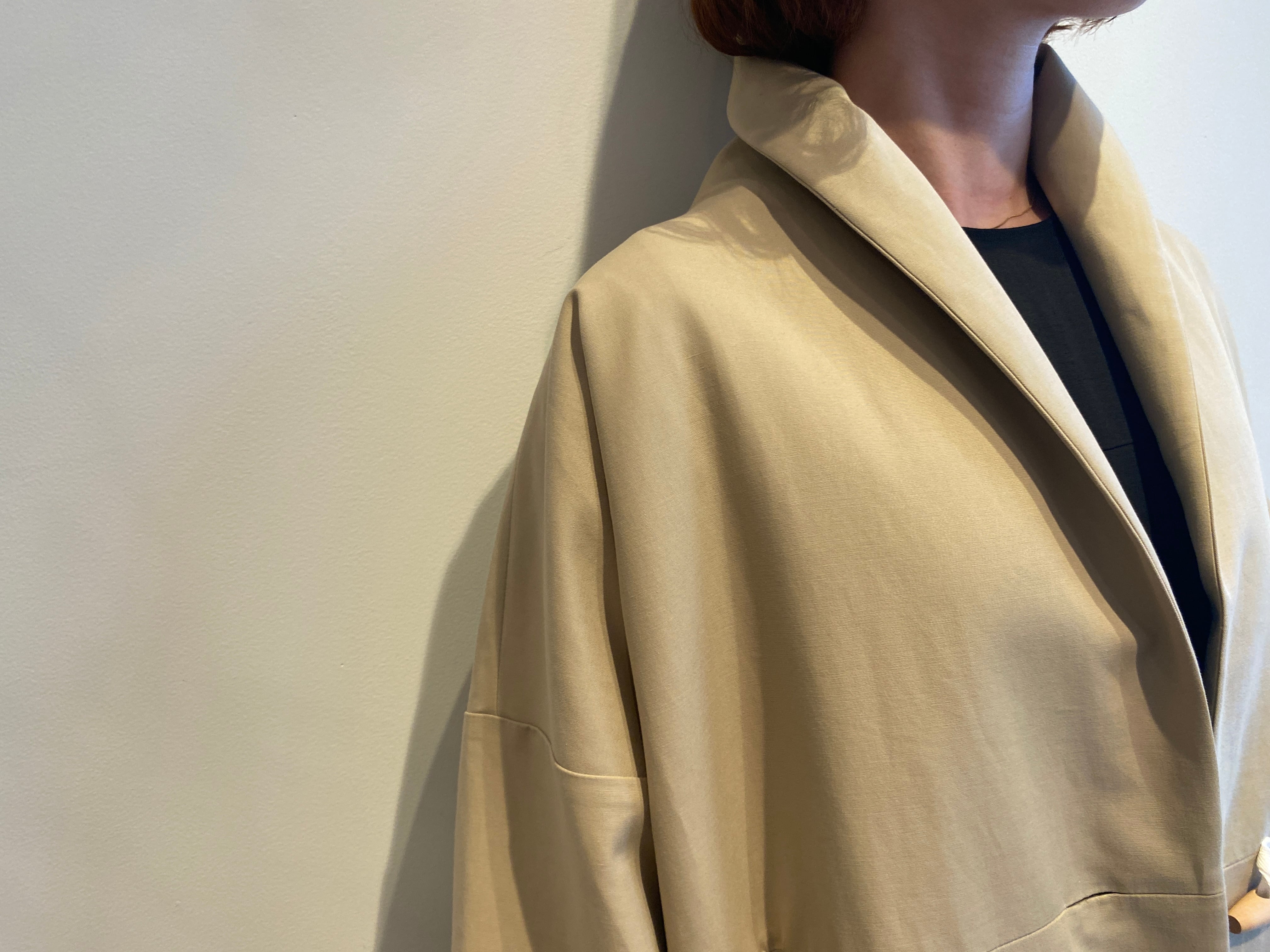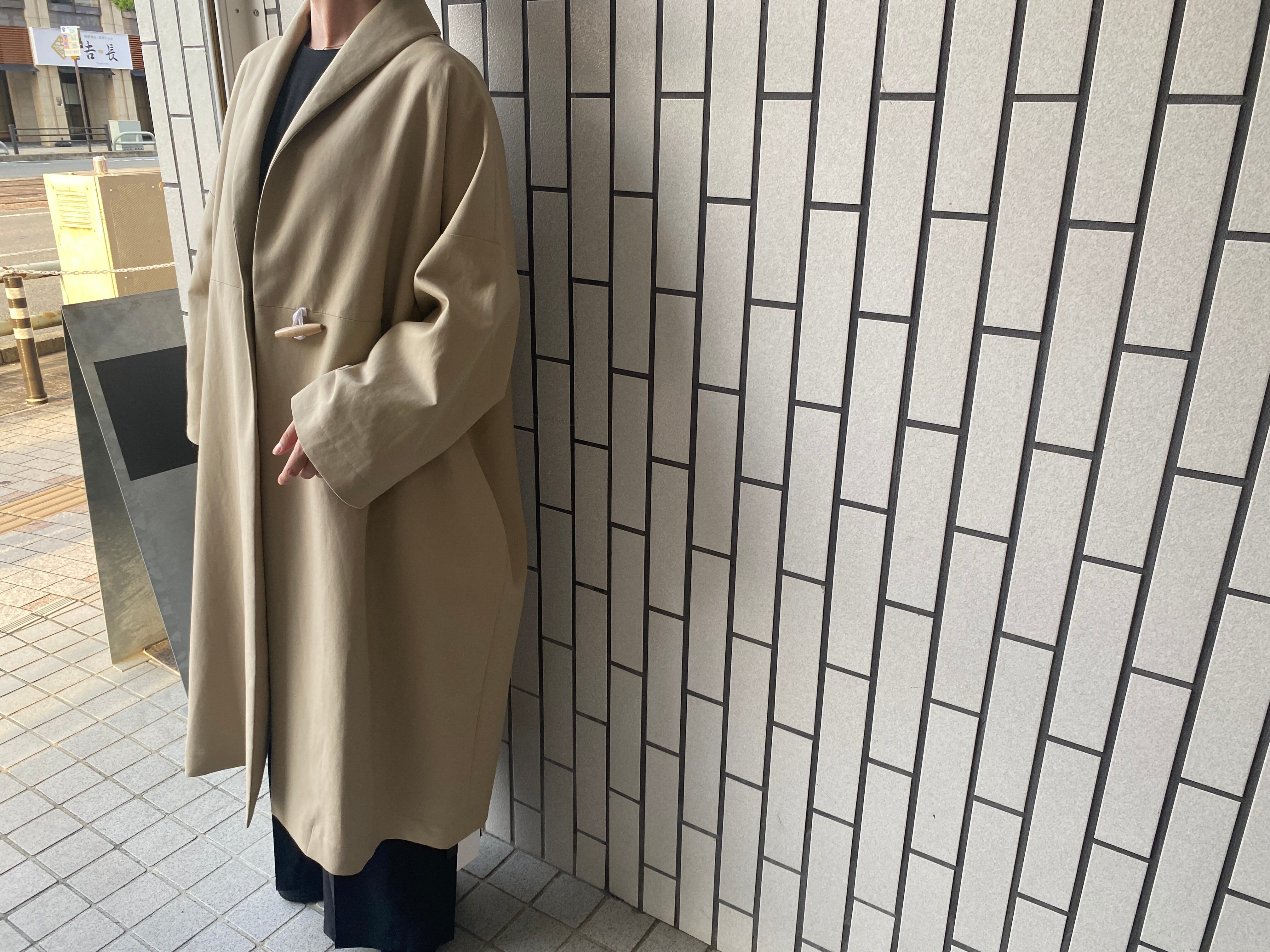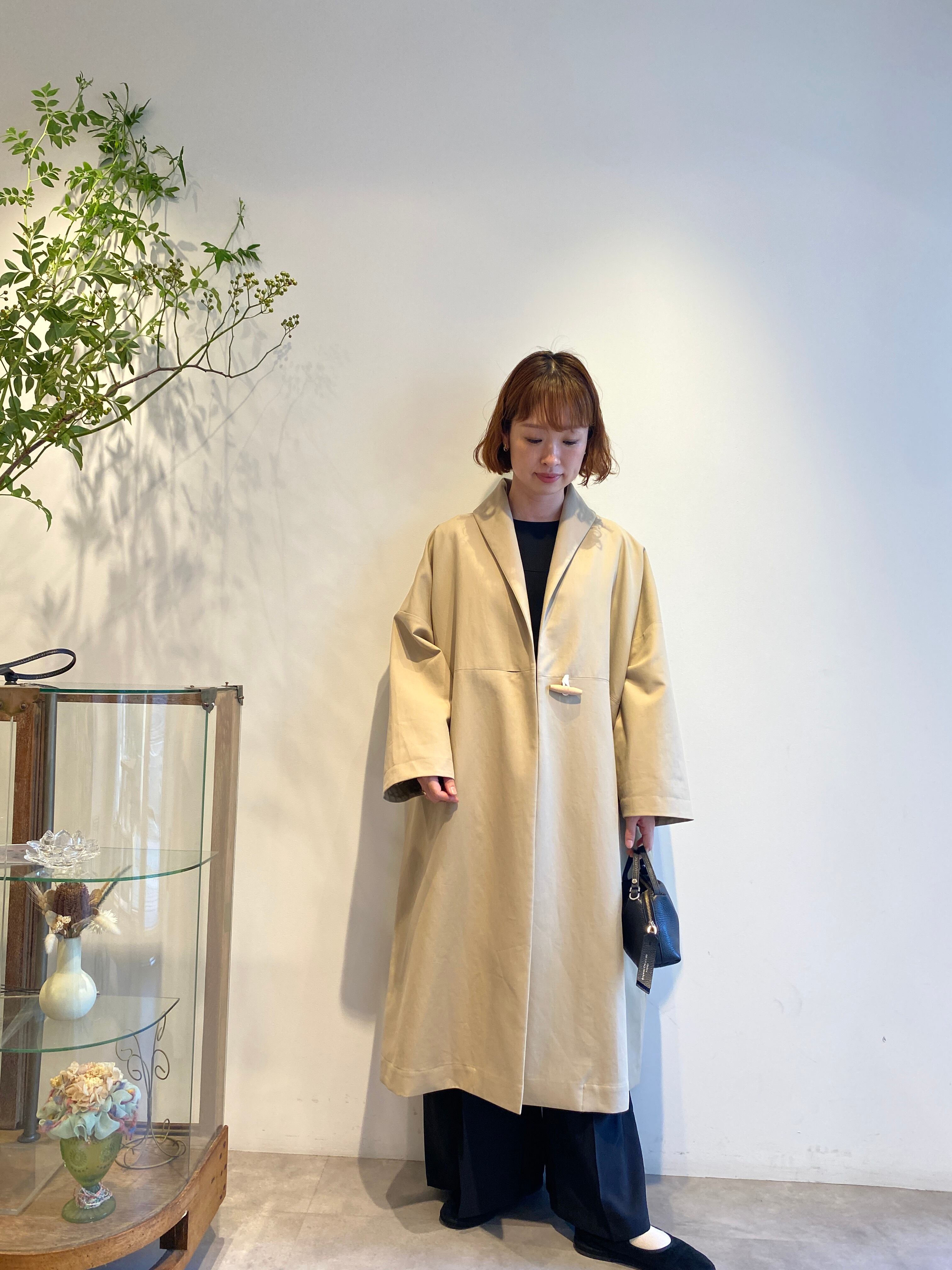 トレンチコートのように着用できるローブコートを