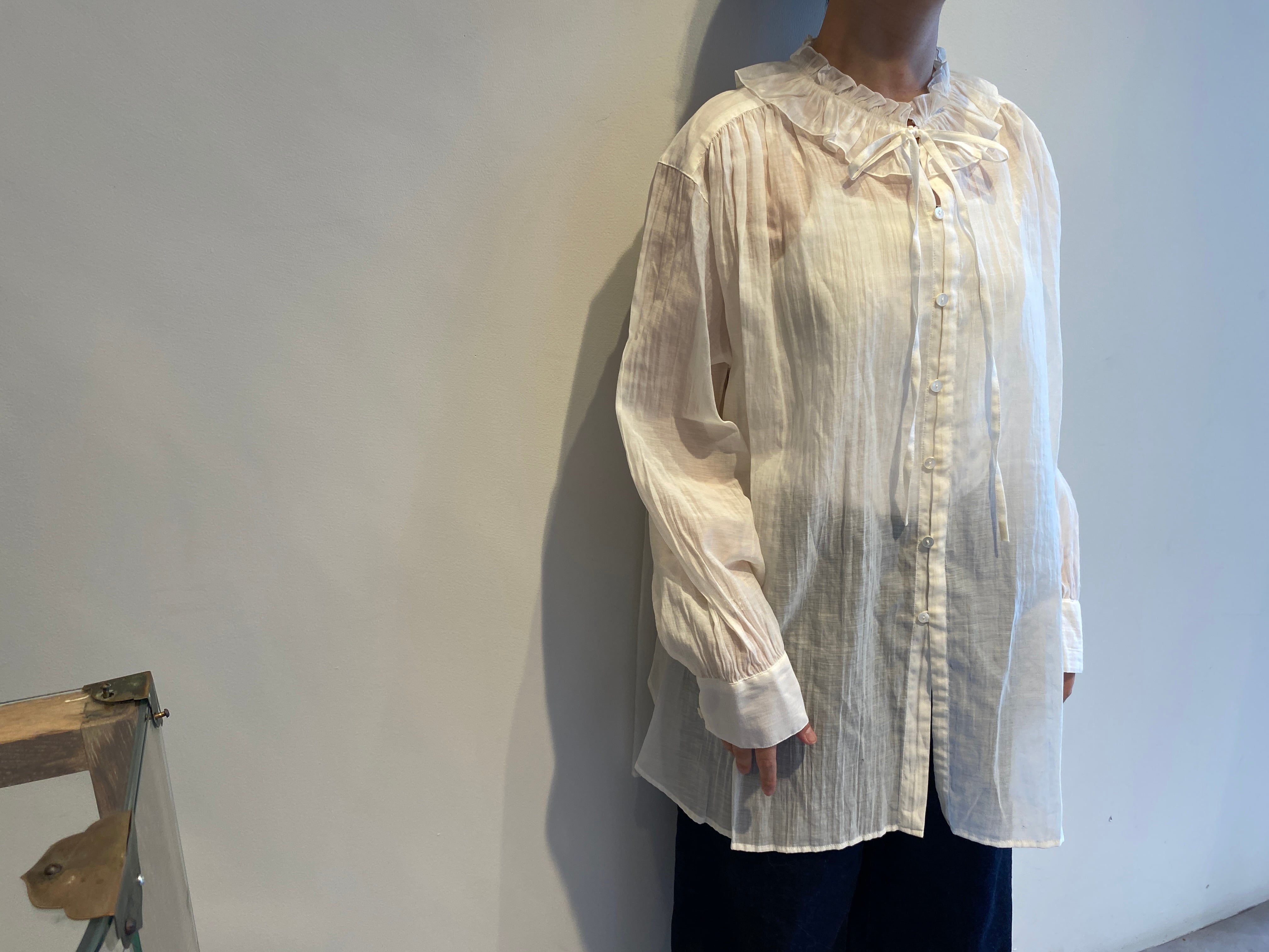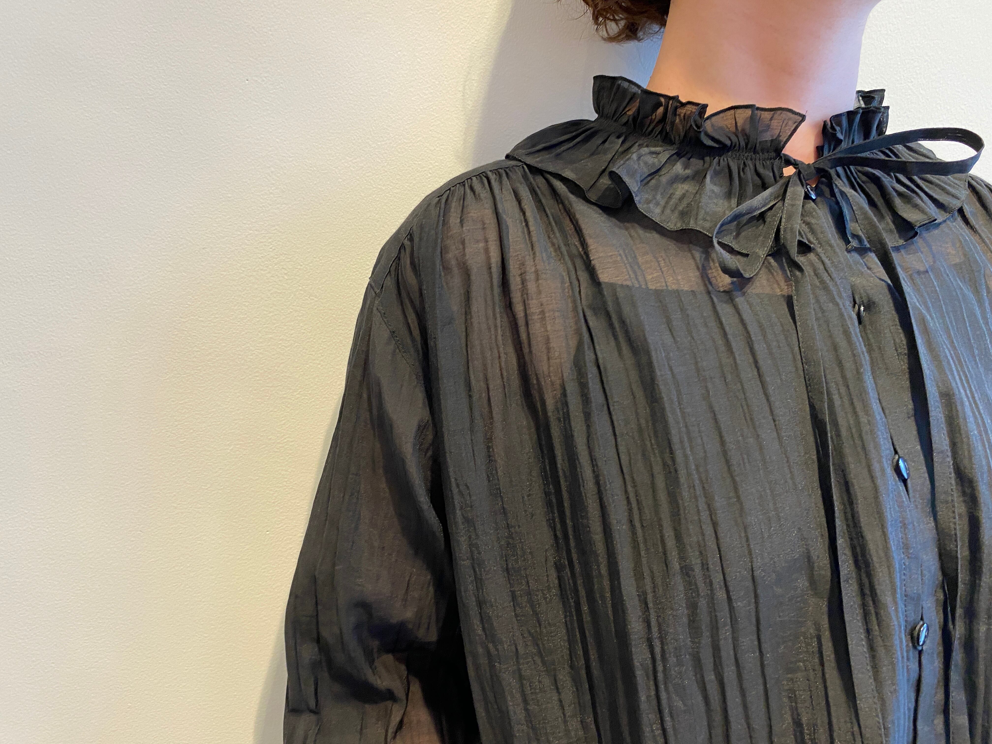 繊細な透け感とナイロンの控えめな光沢が美しいローン生地を使用したフリルブラウス。