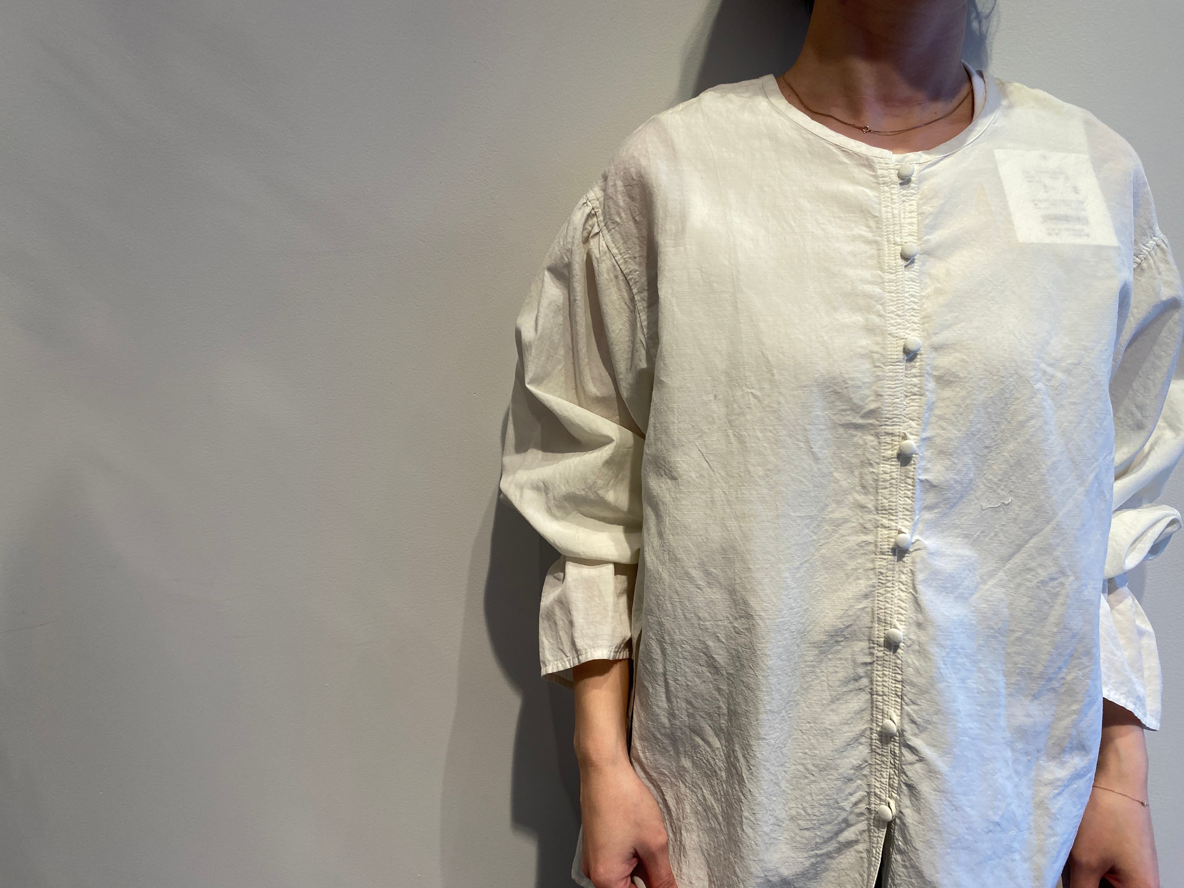 袖口にギャザーをたっぷり入れた、ノーカラーデザイン。