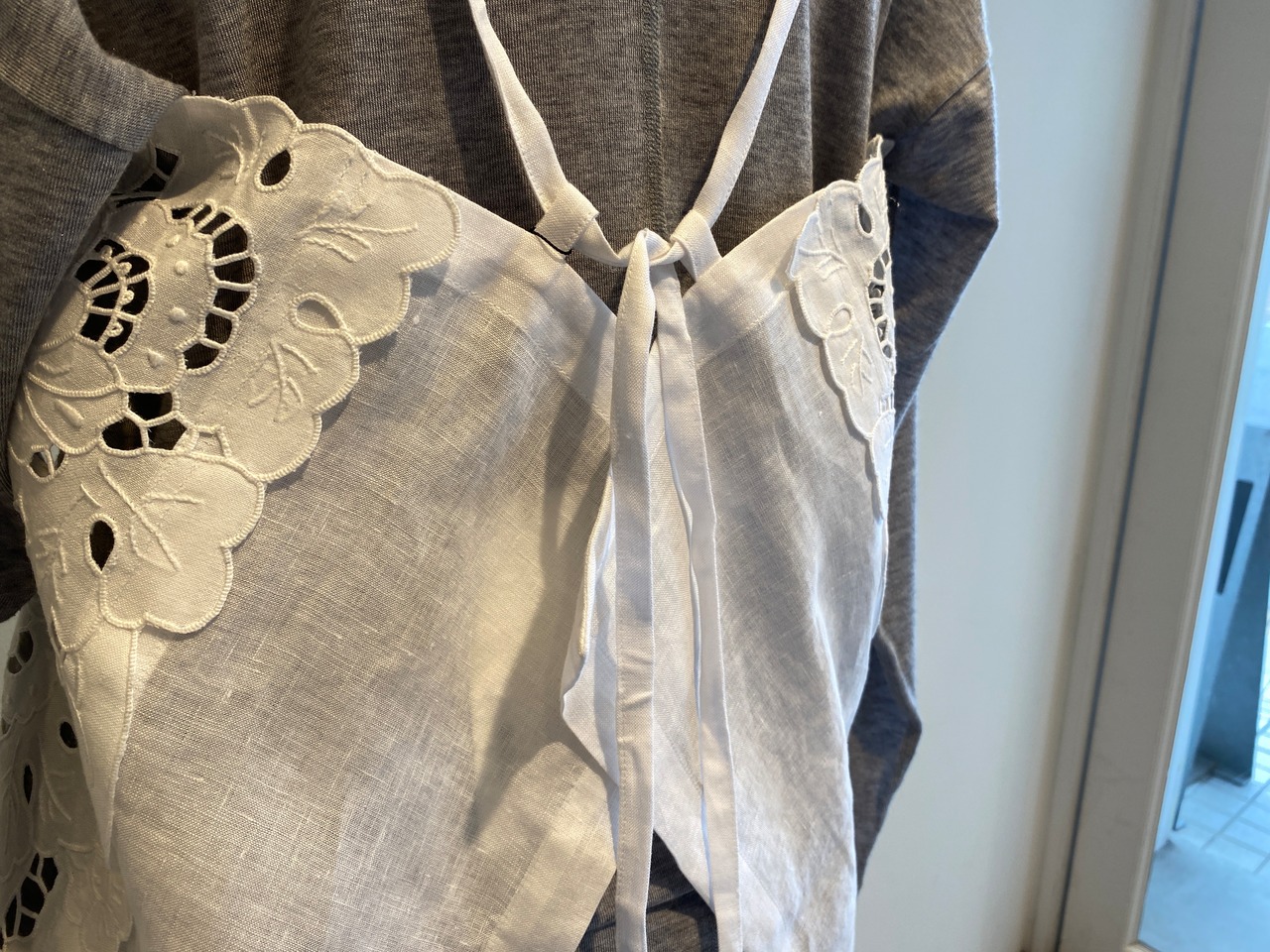 テーブルクロスをリメイクしたエプロンドレス。
