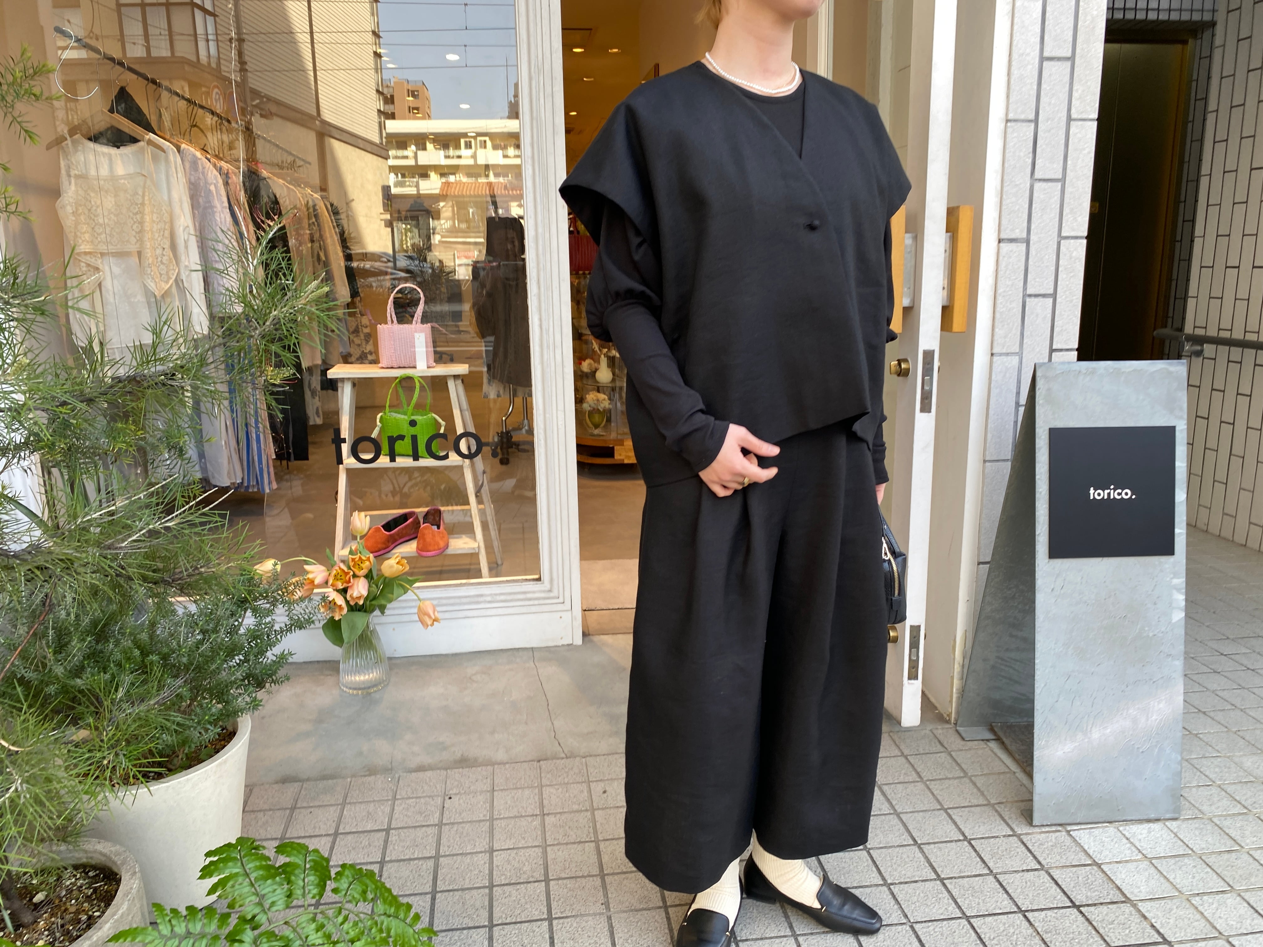 ワイドシルエットのパンツ。