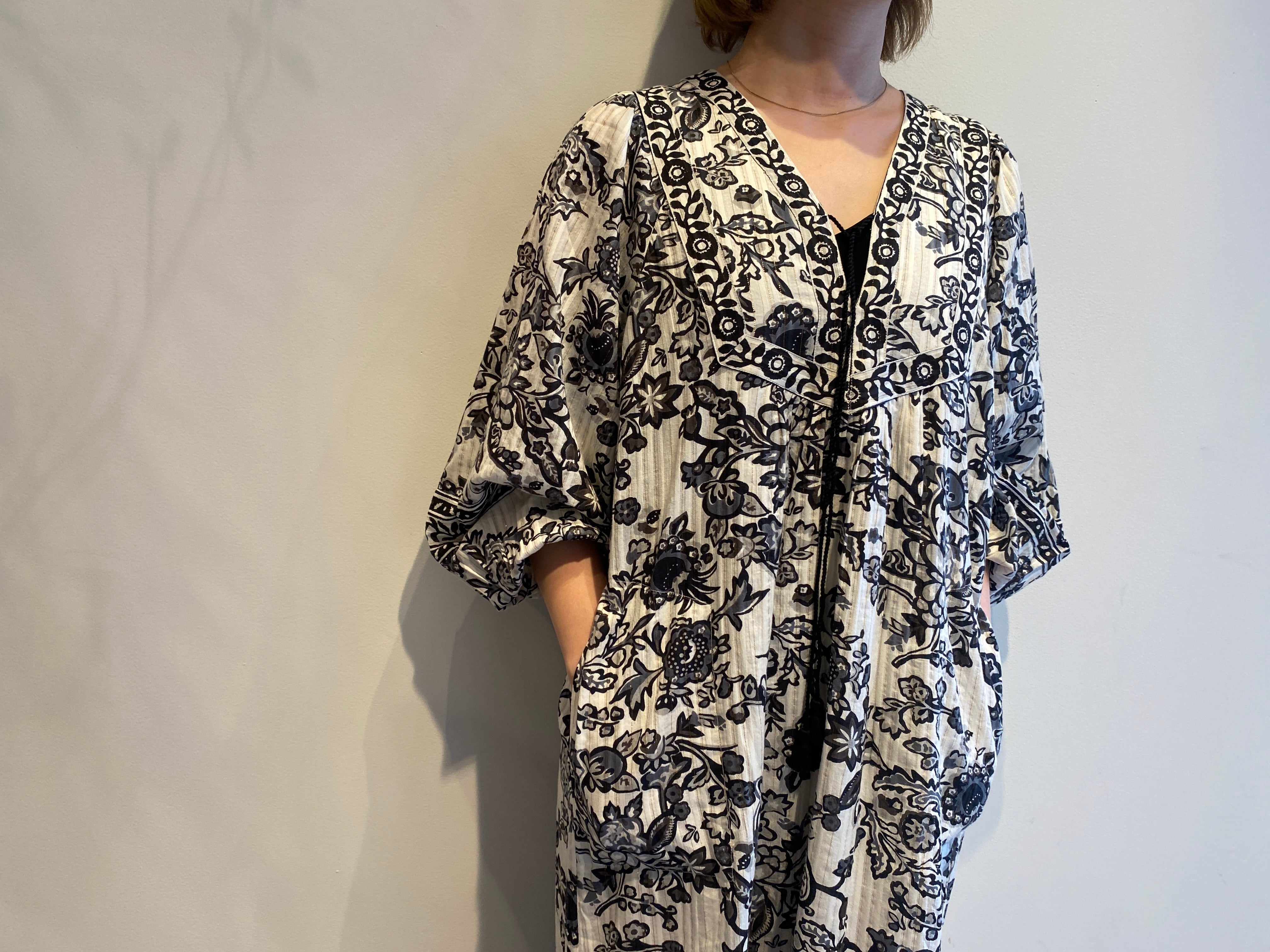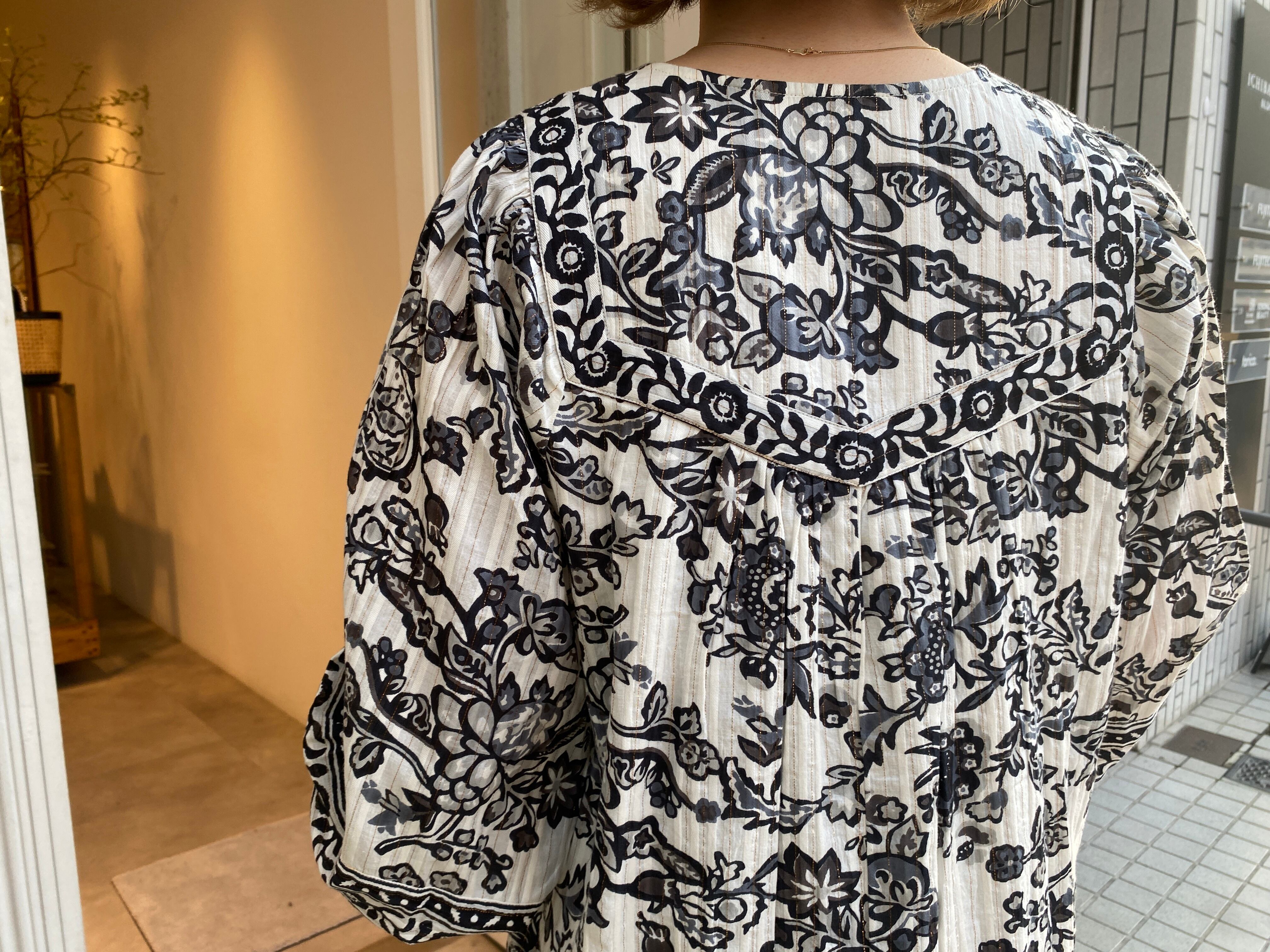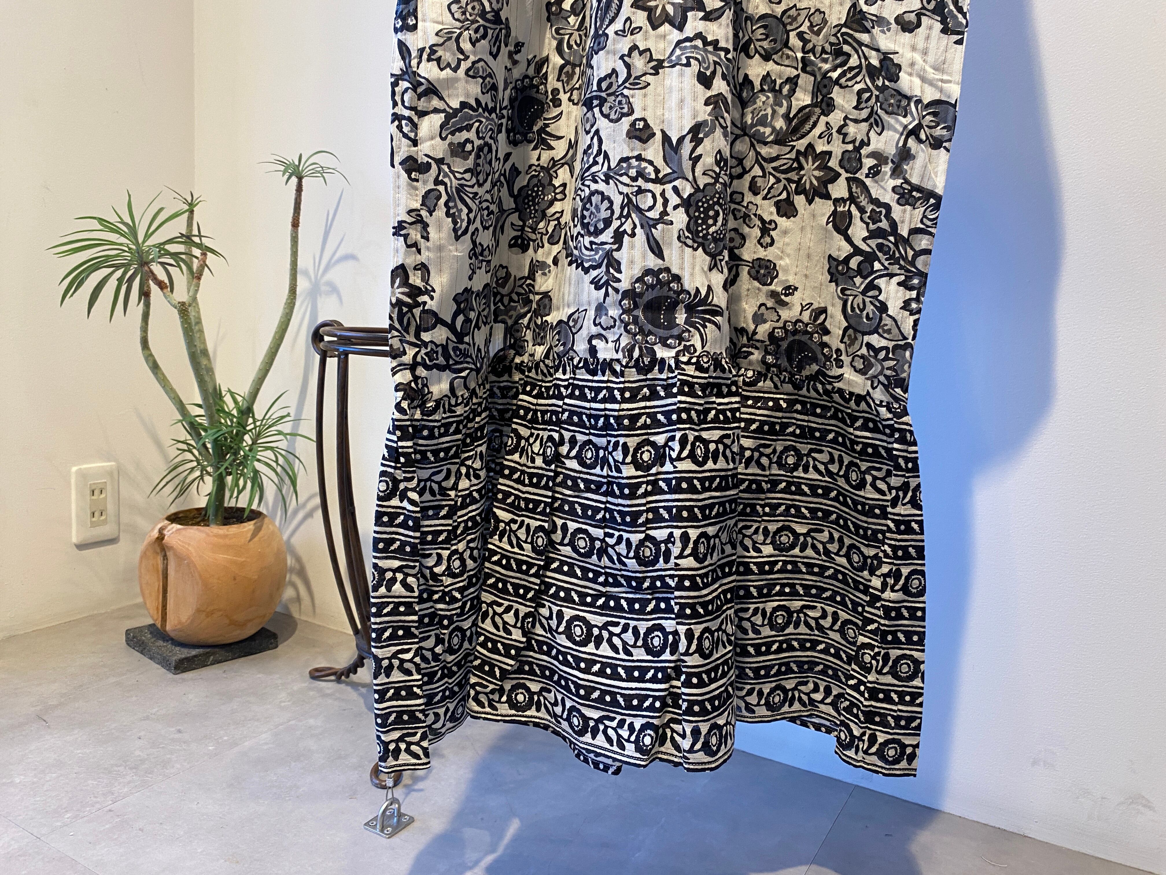 金糸を織り込んだドビー織の生地にペイズリー柄のようなフラワープリントを重ねたドレス。