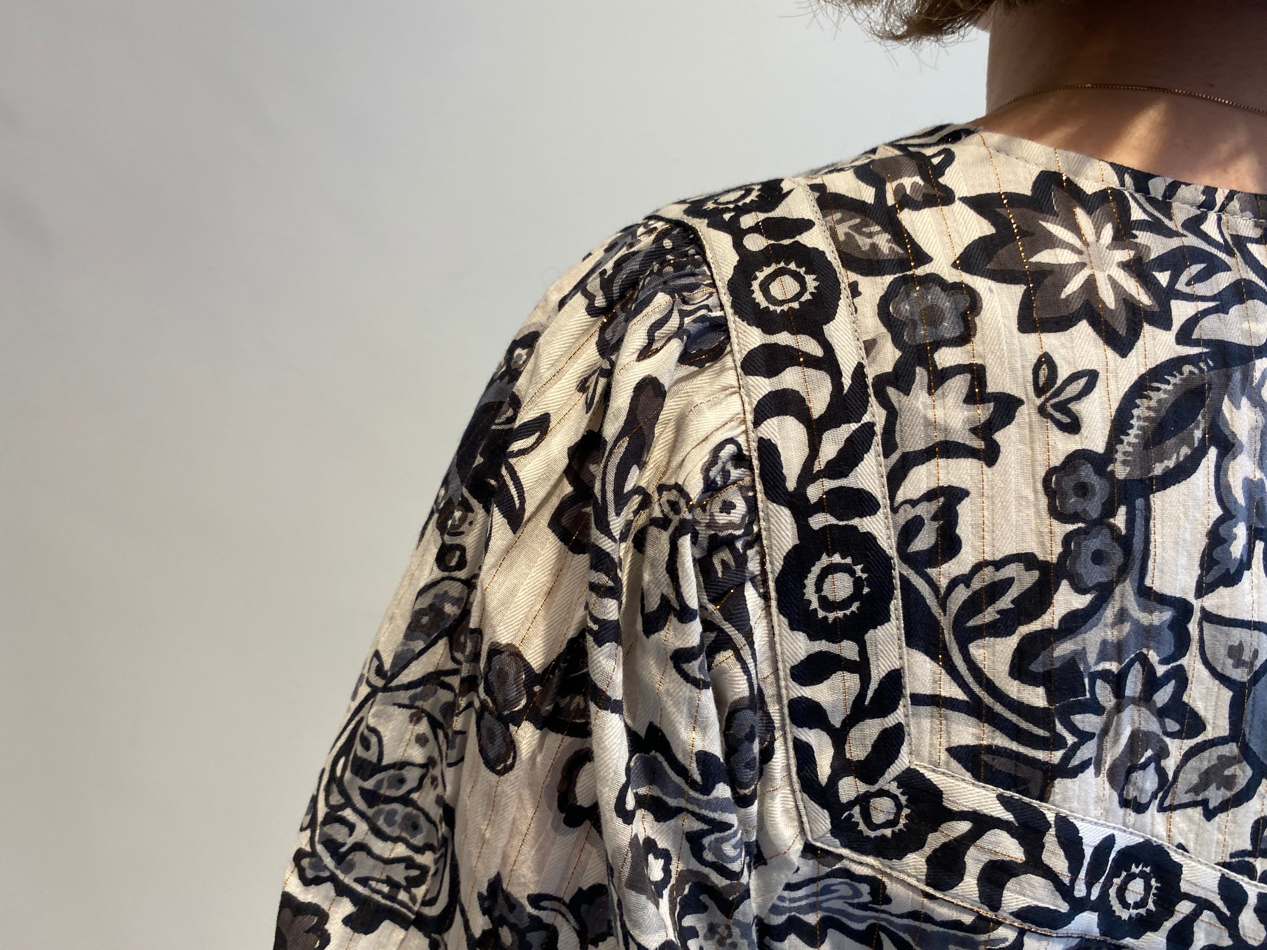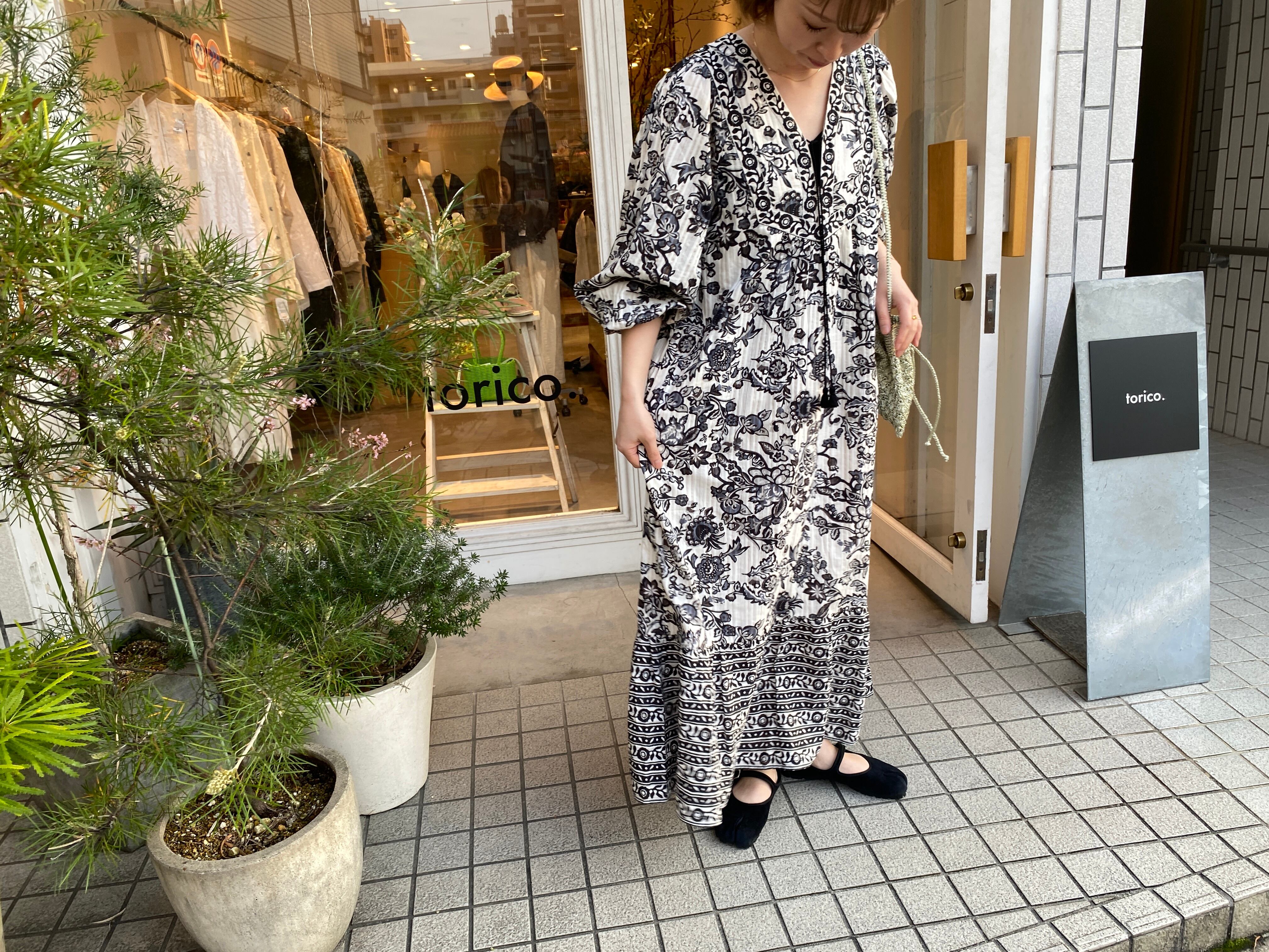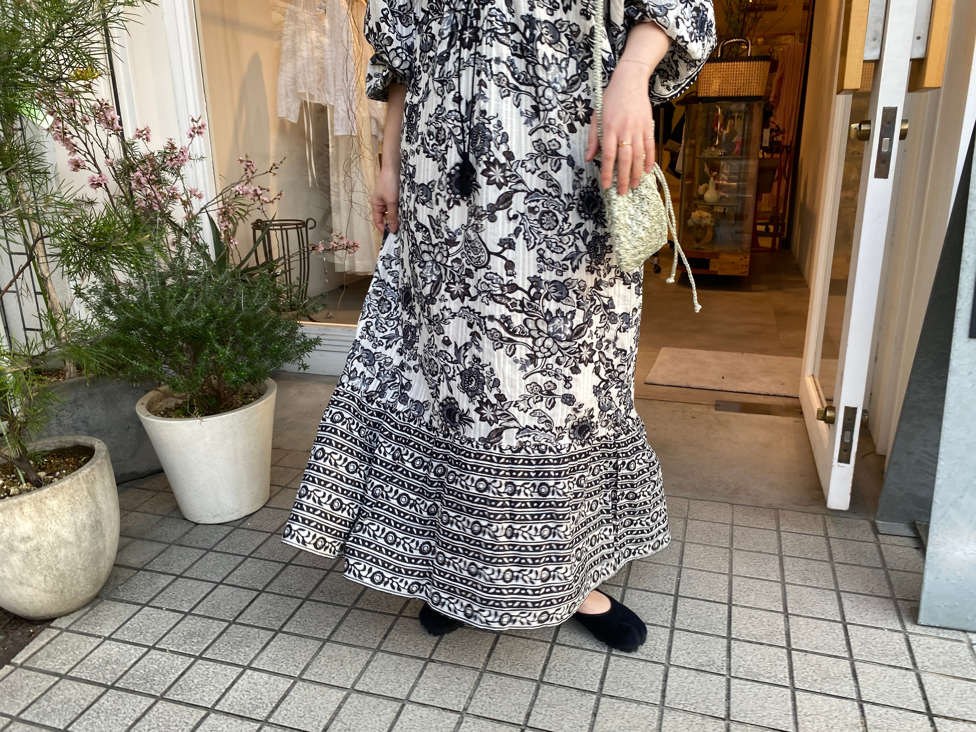 金糸を織り込んだドビー織の生地にペイズリー柄のようなフラワープリントを重ねたドレス。