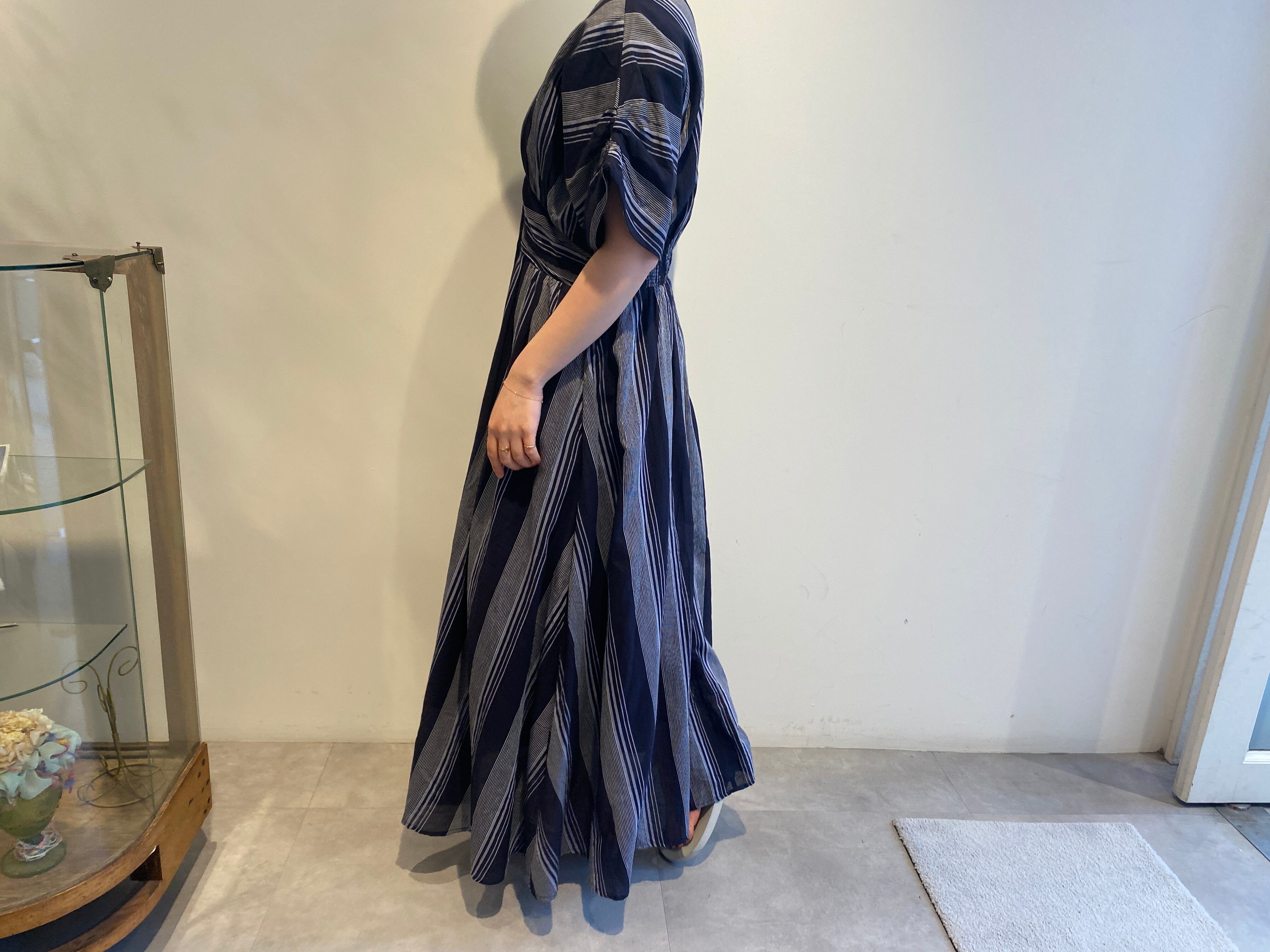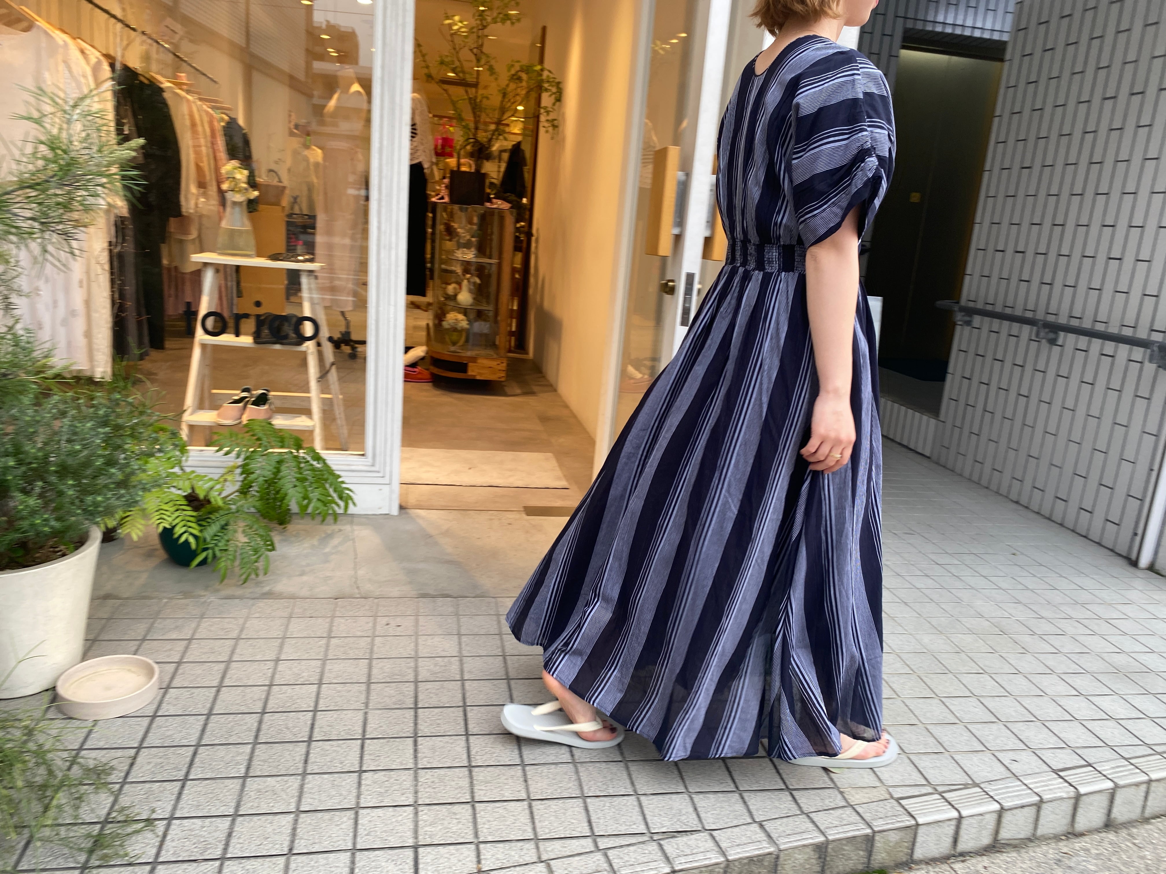 さまざまなストライプが楽しいコットンボイルで仕立てた定番のウエストギャザードレス。