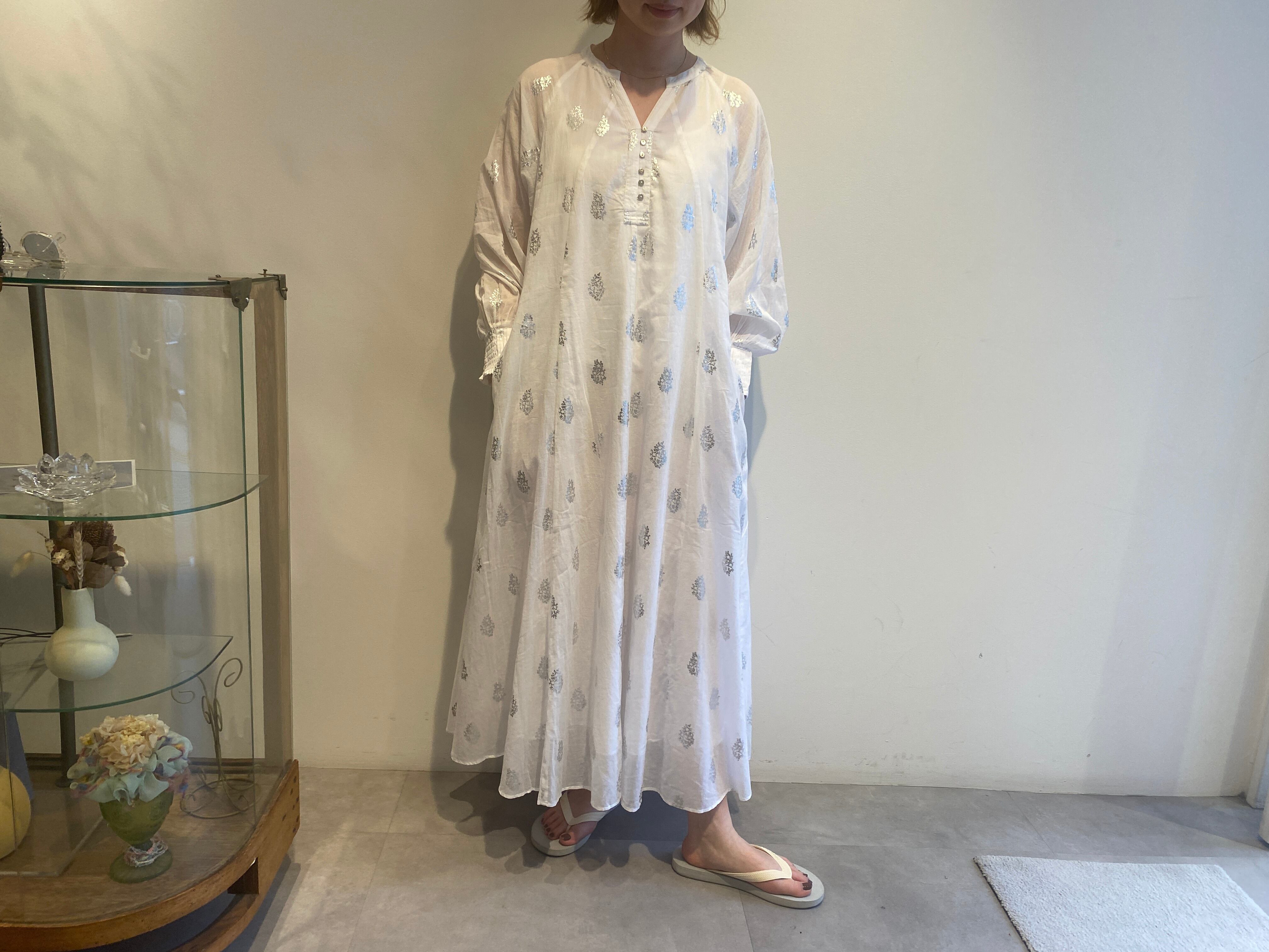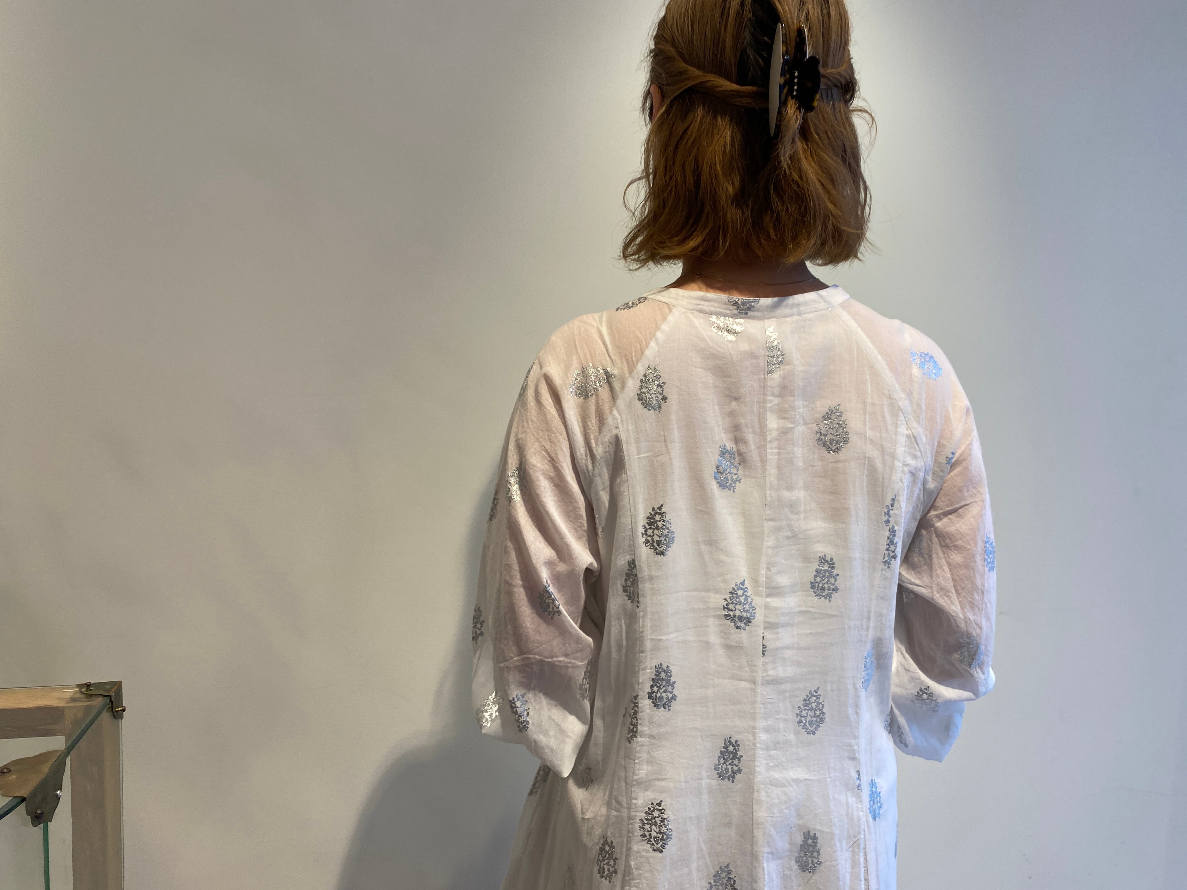 胸元にメタルボタンが並び、静かにきらめく箔プリントと呼応して品を添えます。