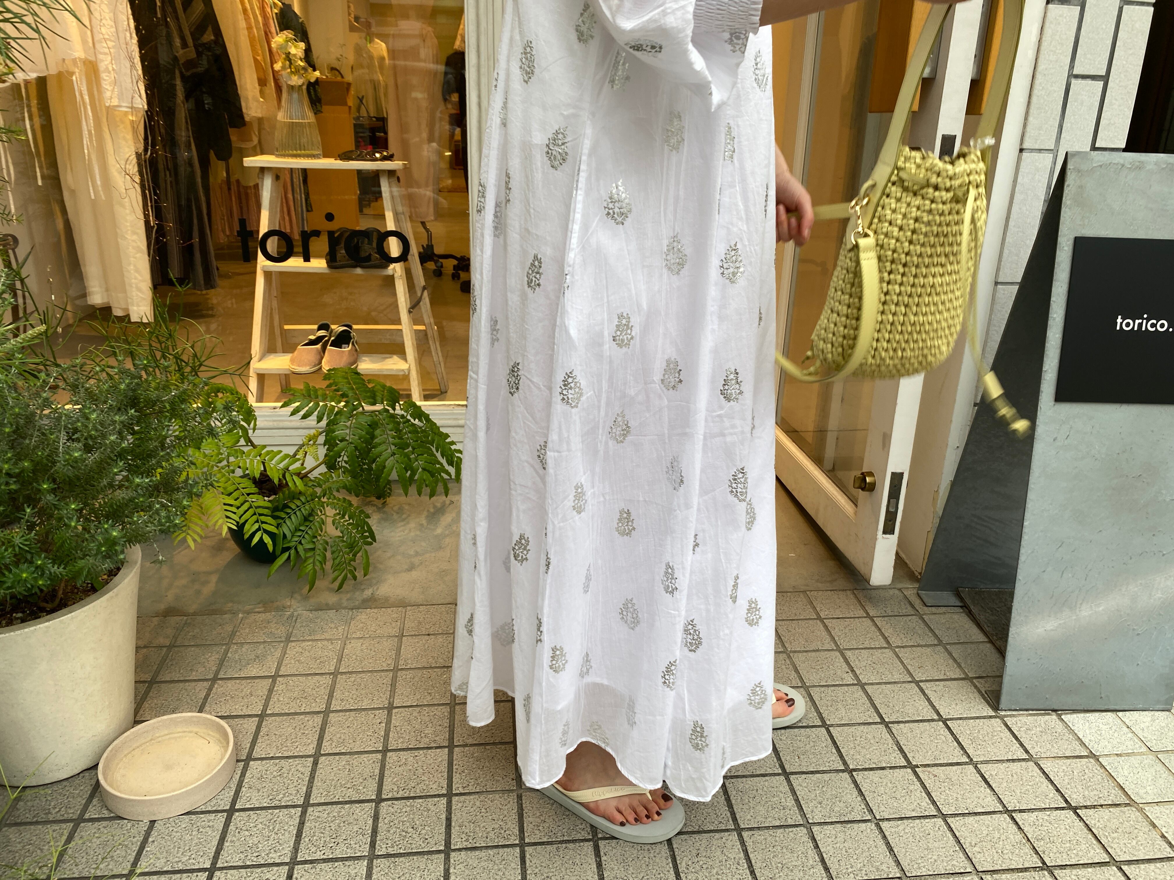 トップはボリュームを抑え、スカートは裾にかけて豊かに広がるデザインが身体のバランスをきれいに見せてくれます。