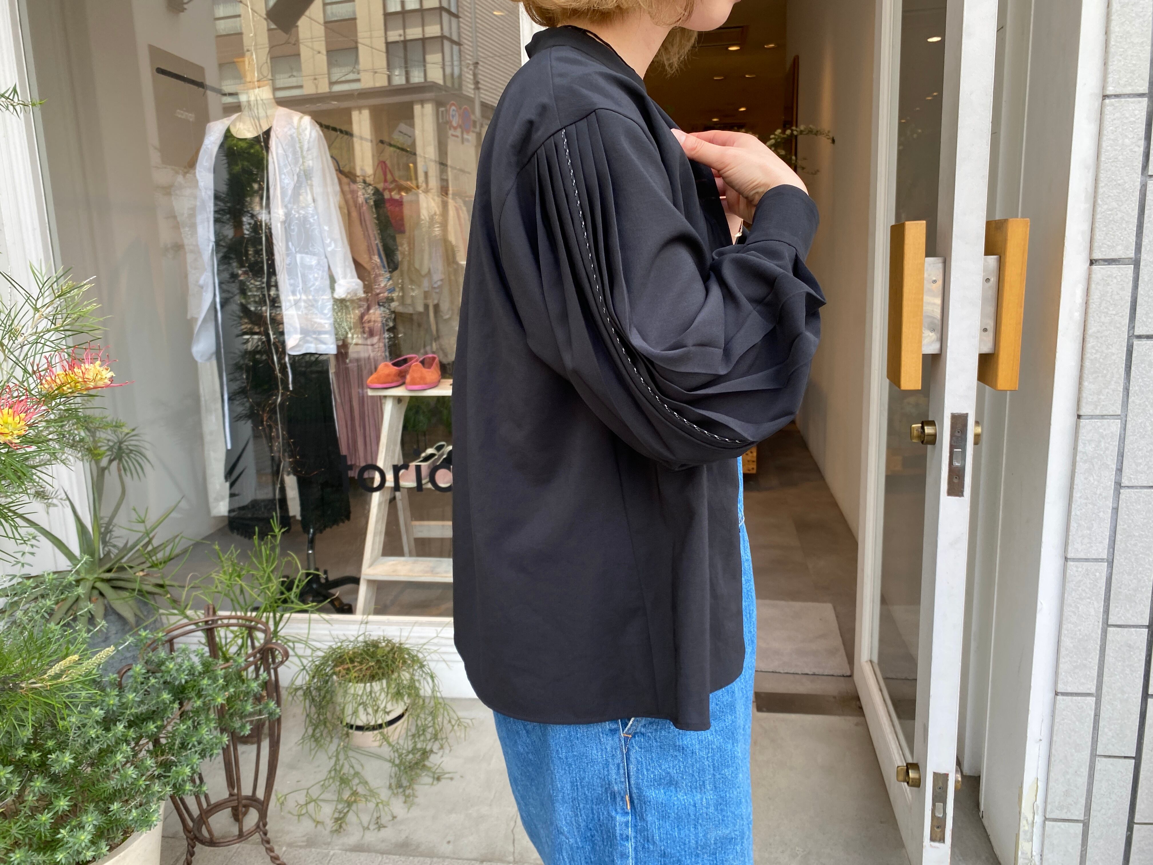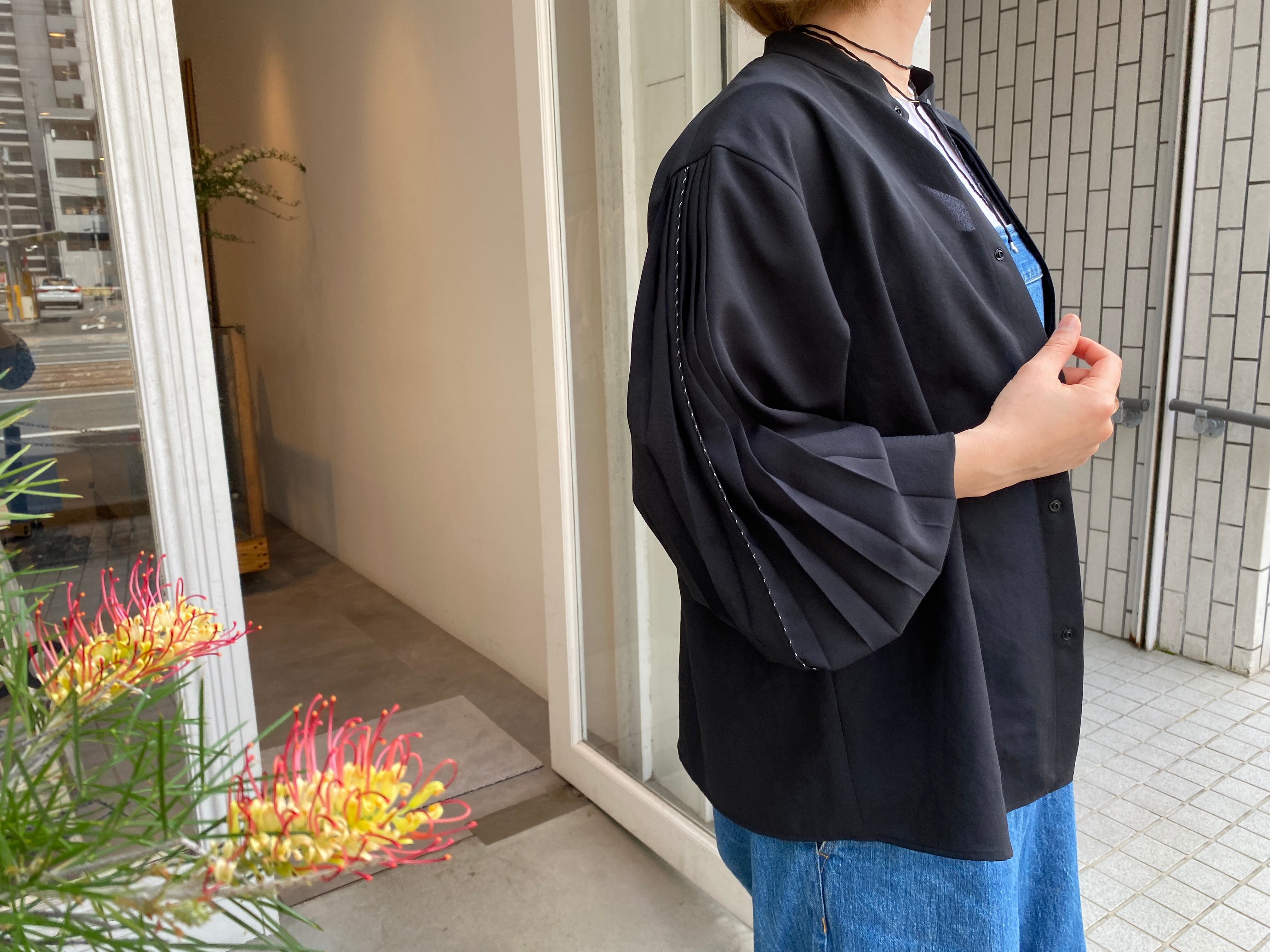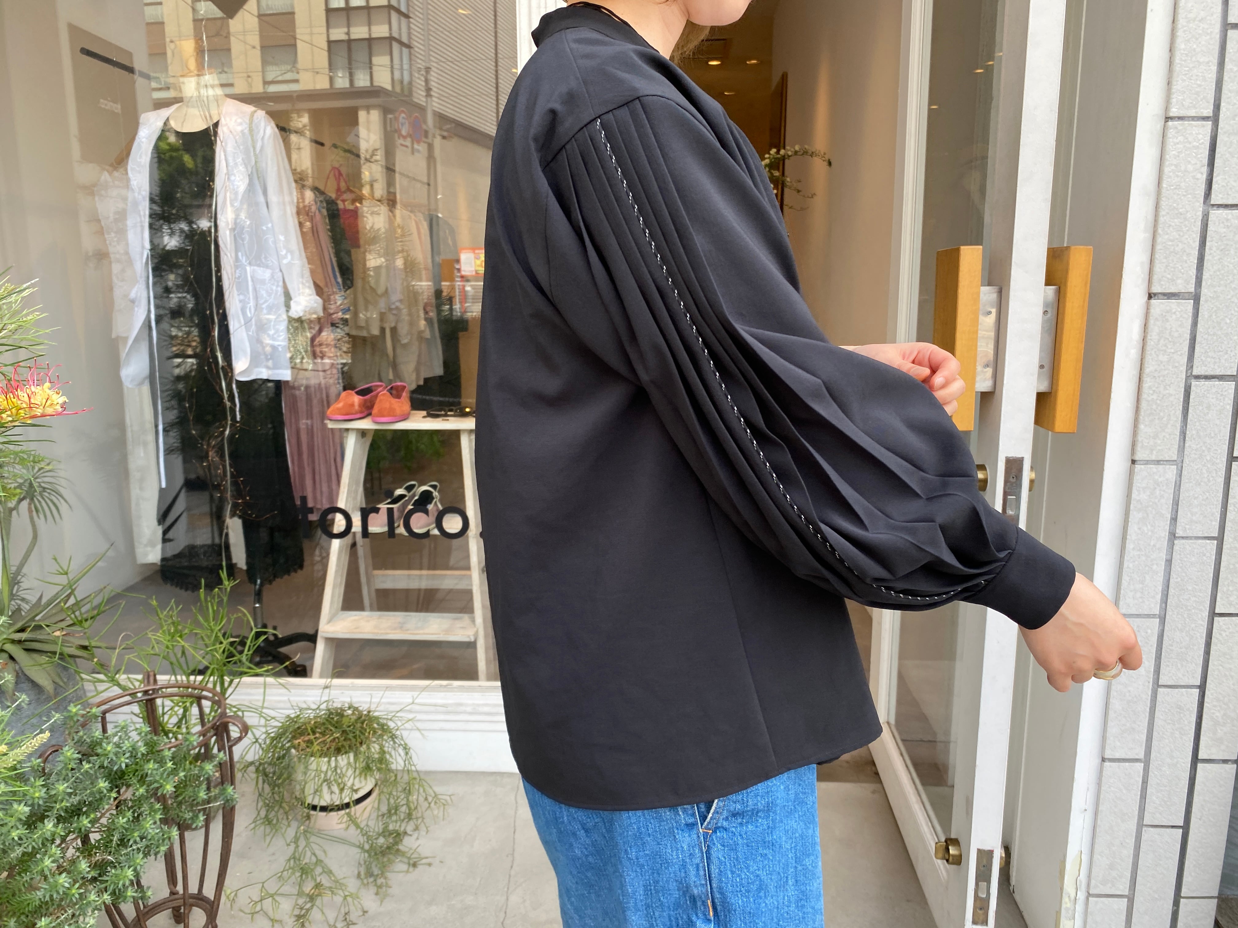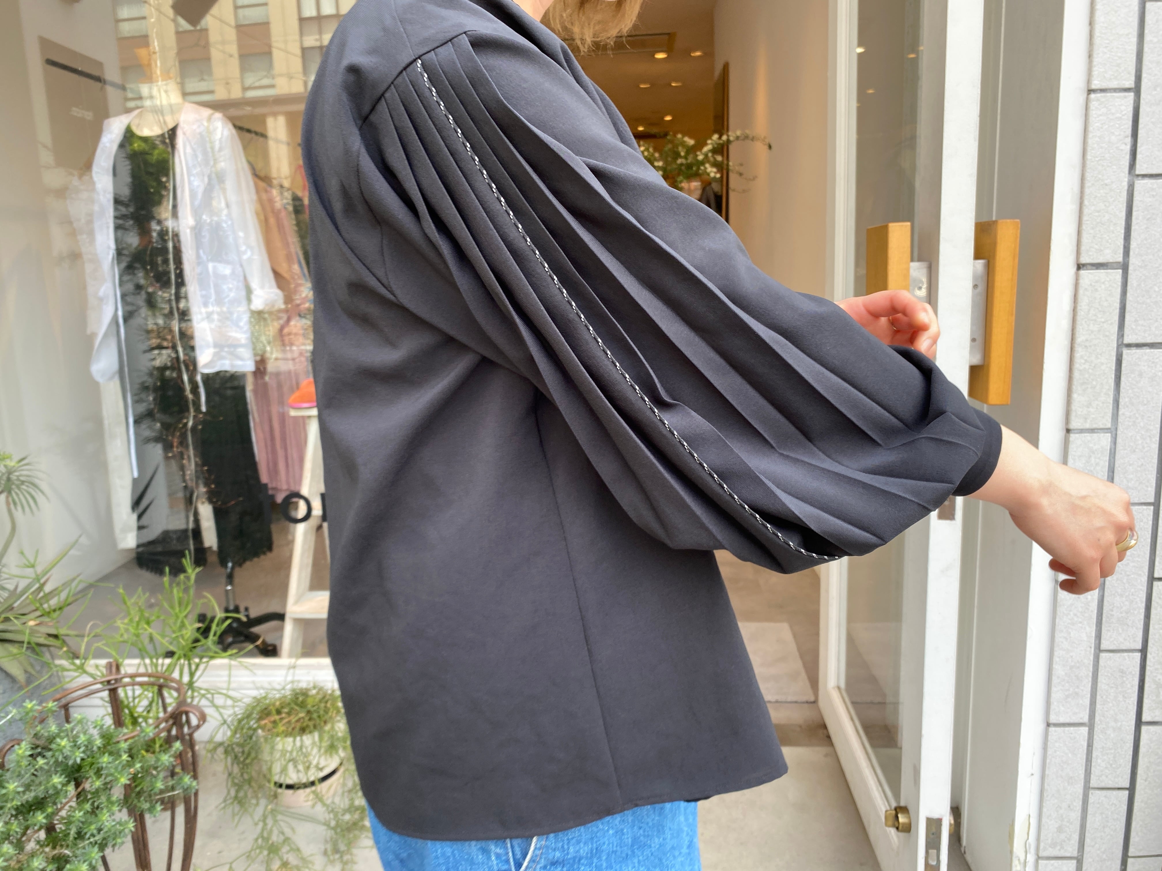 袖口の釦を開閉することで7本のプリーツが連動し、ボリュームあるプリーツの優雅で華やかなイメージと、ストレートなプリーツヒダによるクールなイメージと2つのテイストを行き来するブラウス。