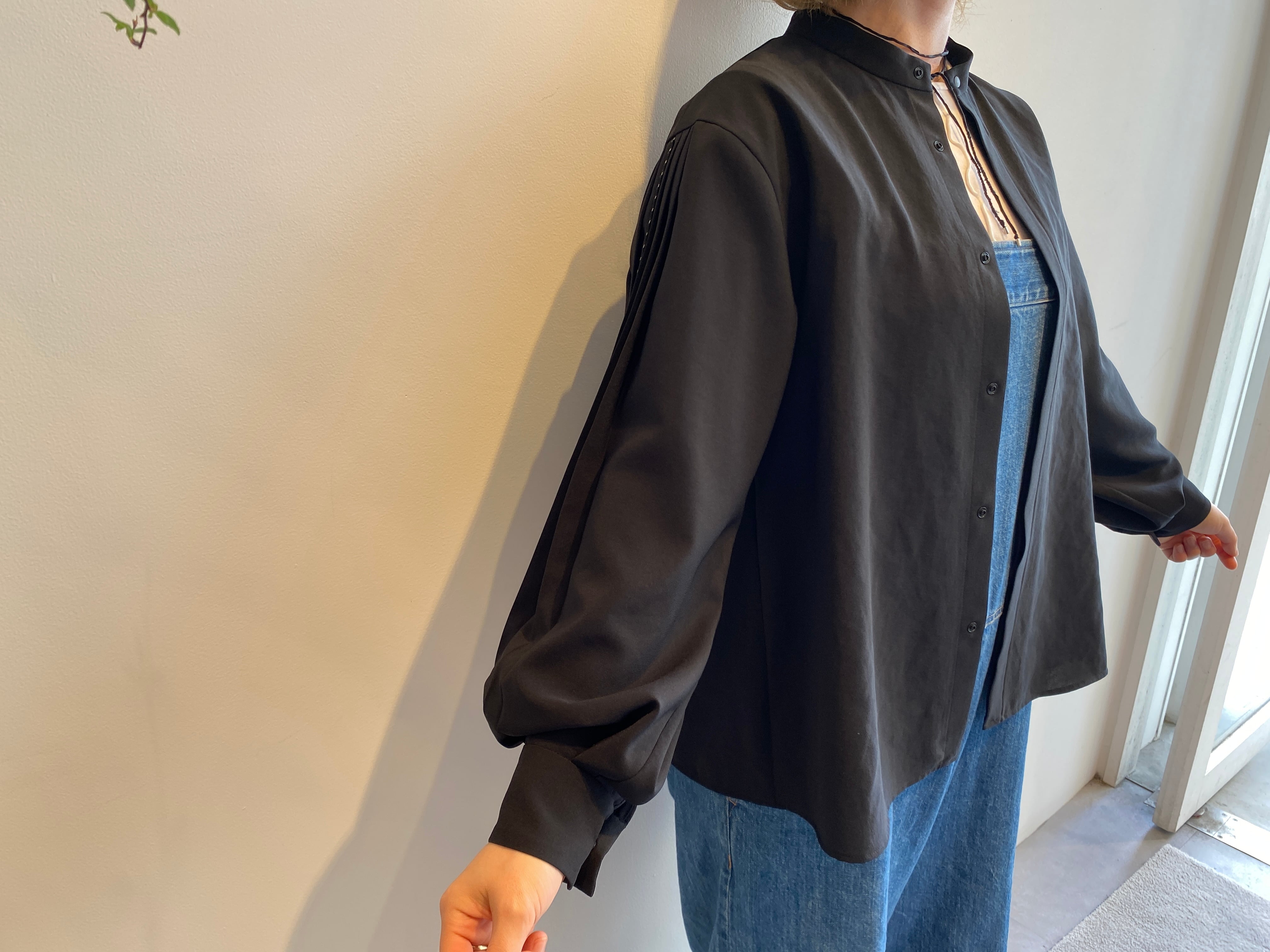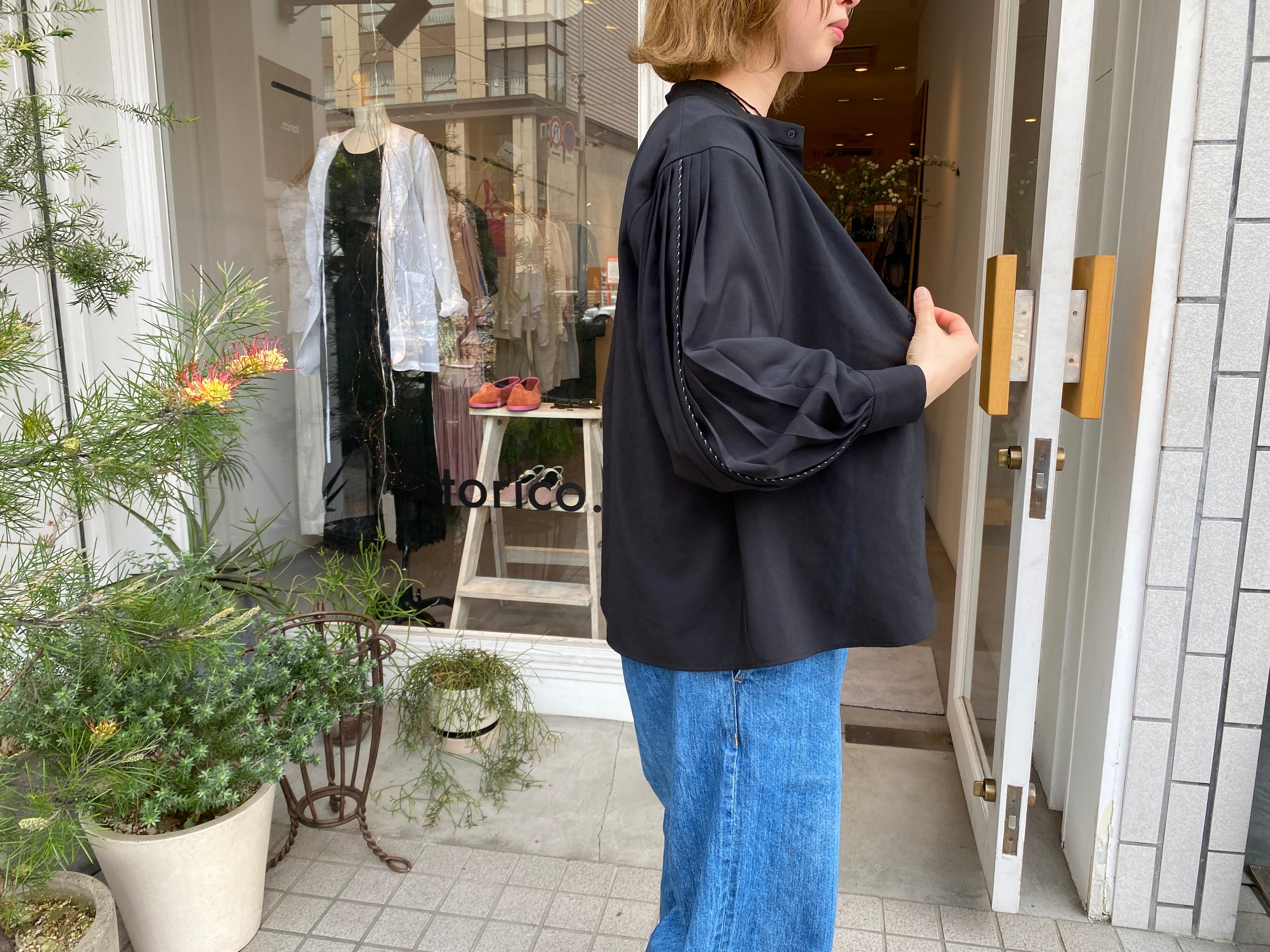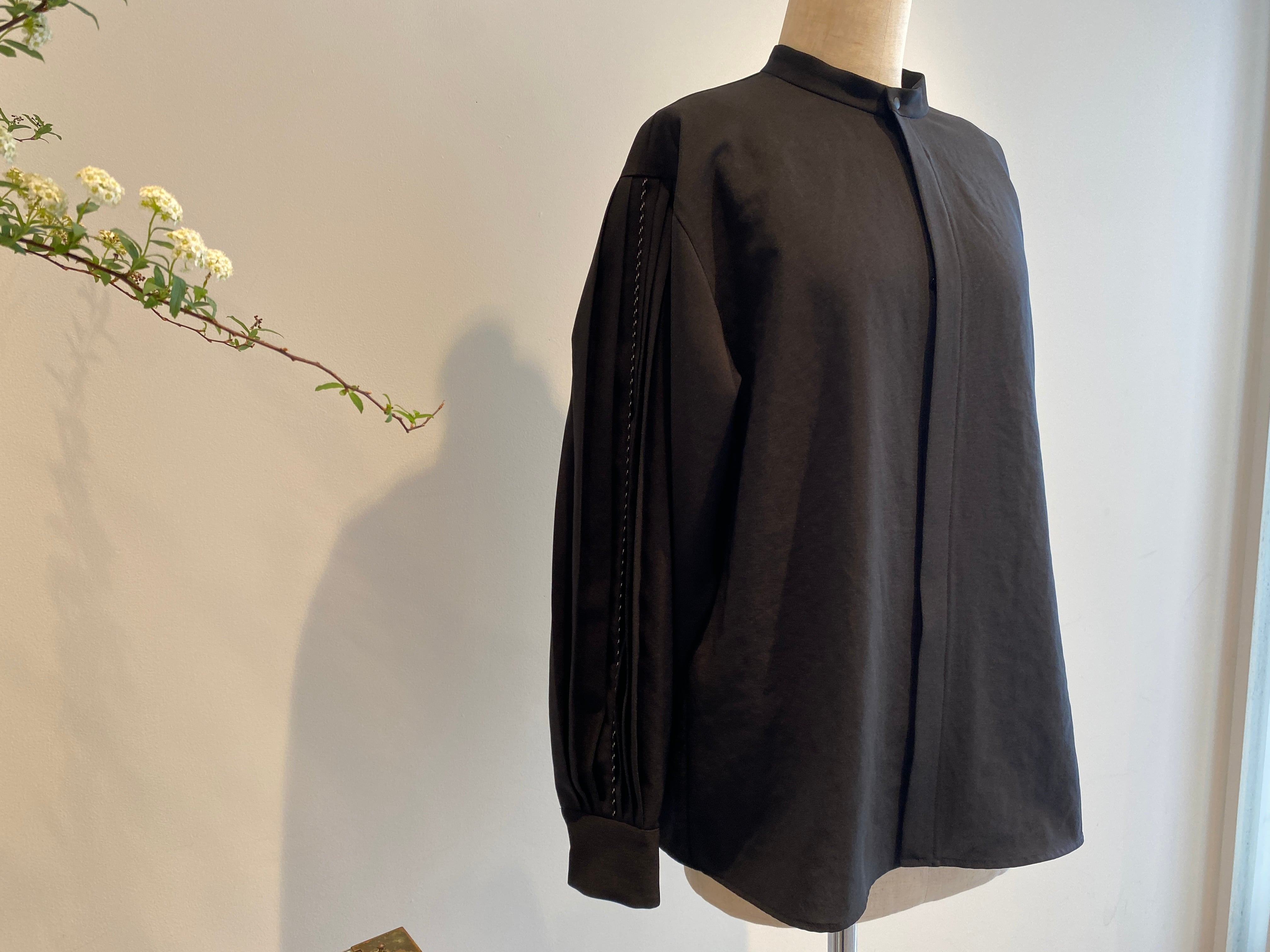 袖口の釦を開閉することで7本のプリーツが連動し、ボリュームあるプリーツの優雅で華やかなイメージと、ストレートなプリーツヒダによるクールなイメージと2つのテイストを行き来するブラウス。