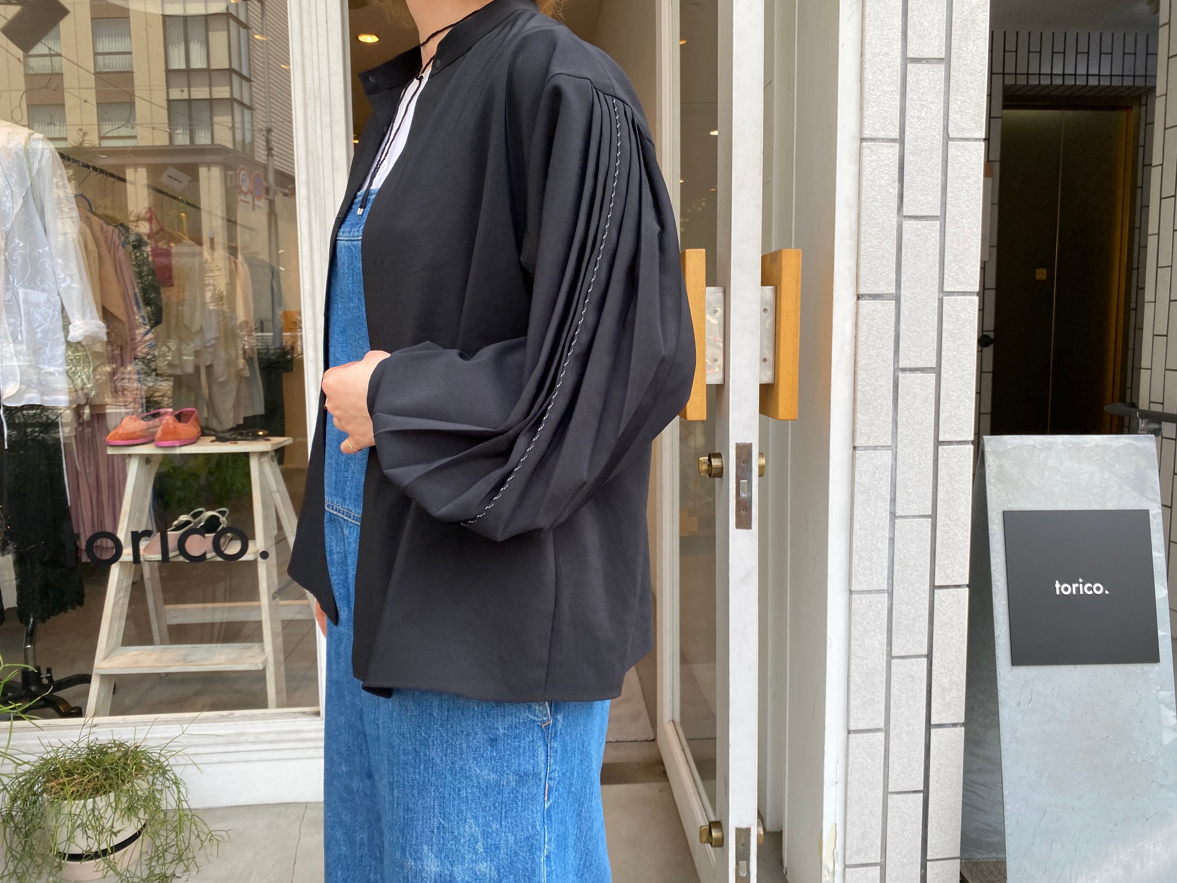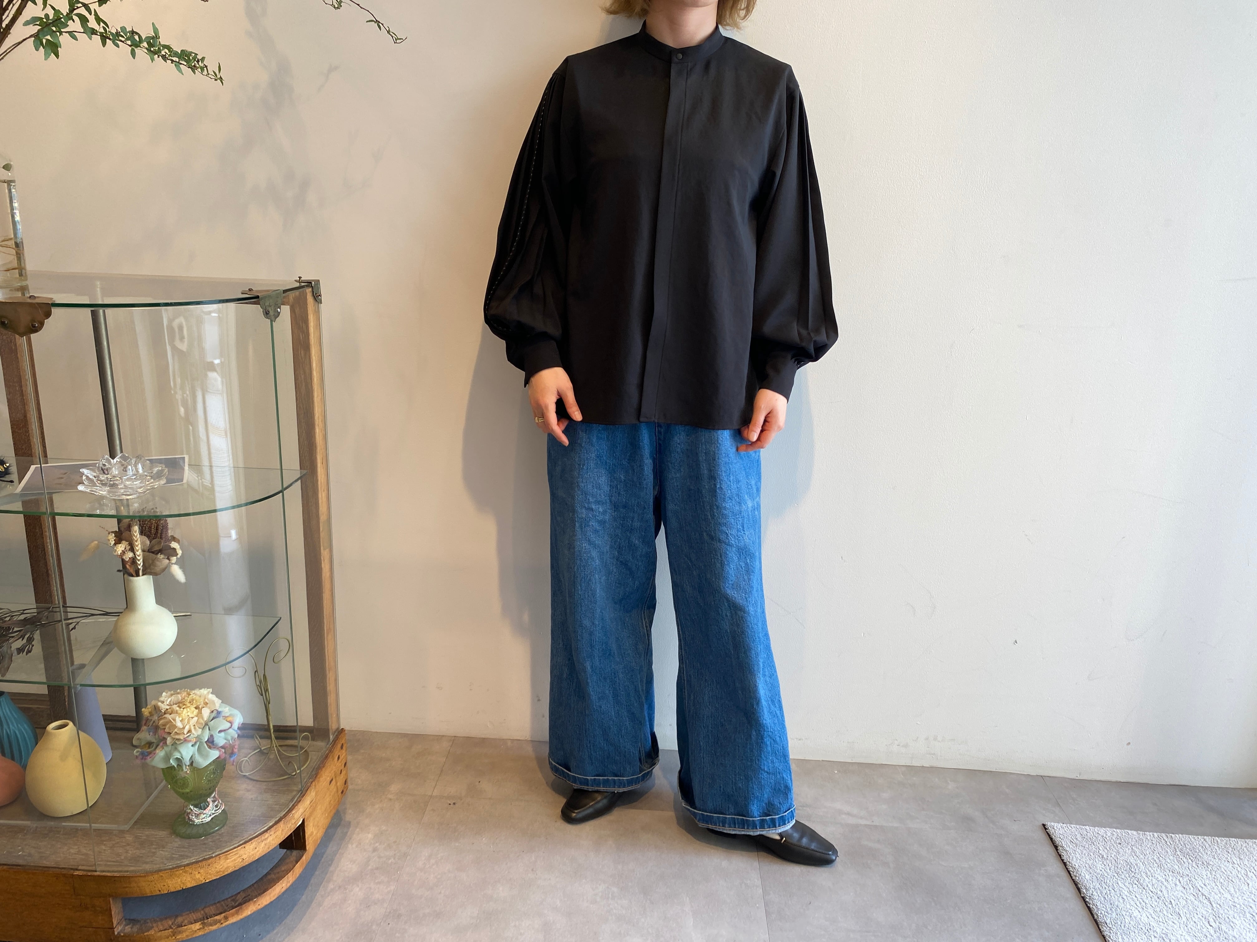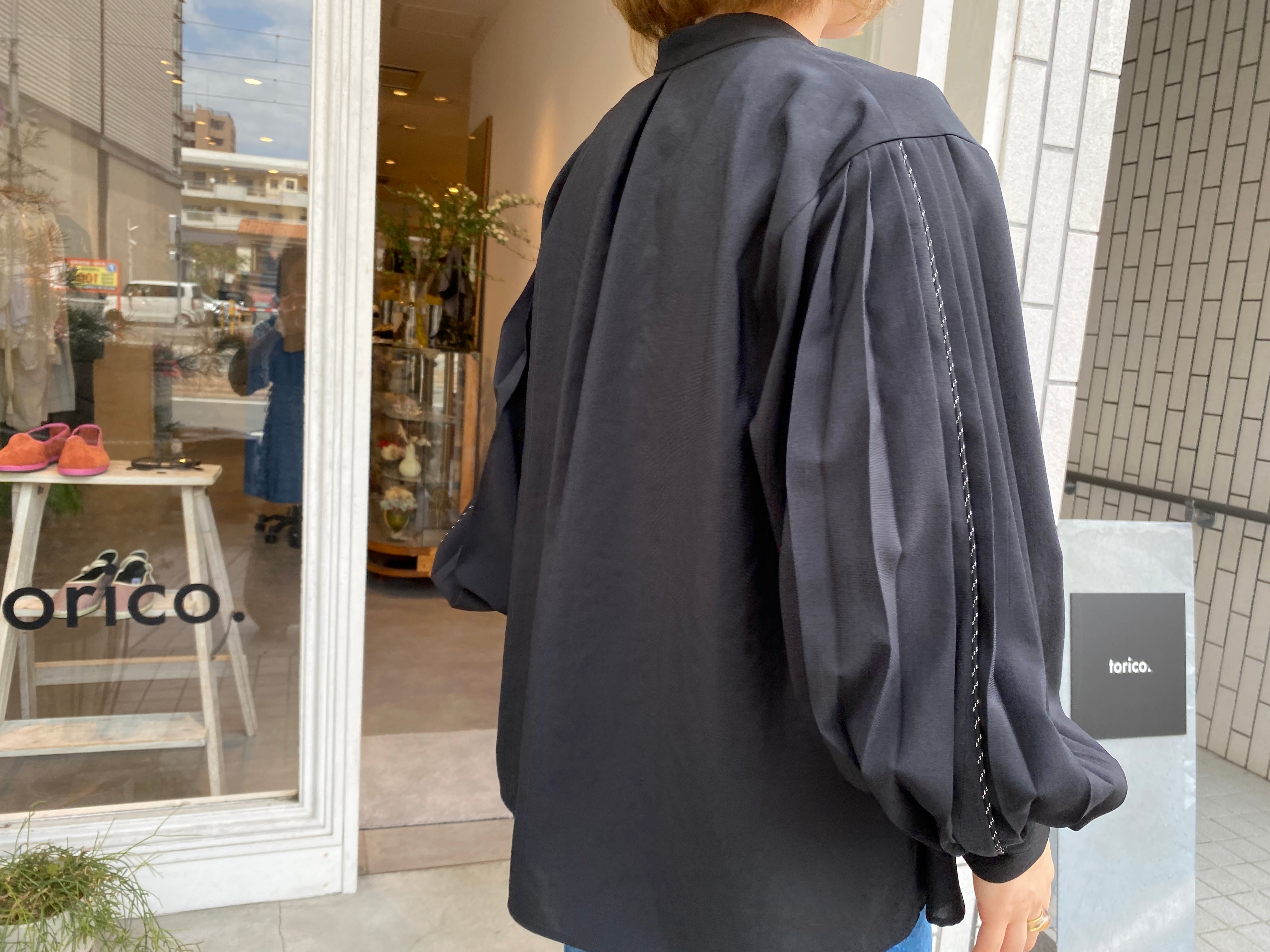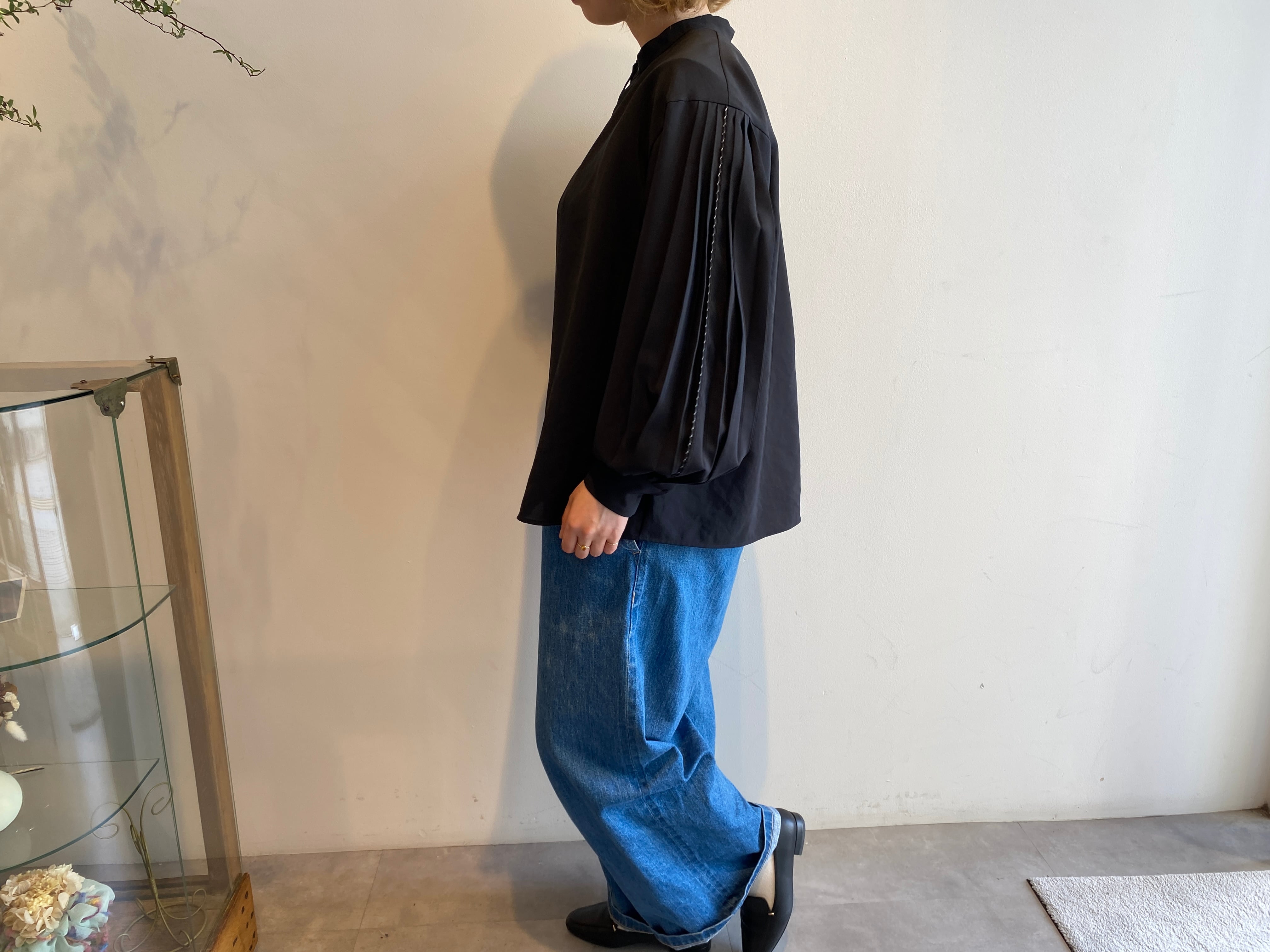 袖口の釦を開閉することで7本のプリーツが連動し、ボリュームあるプリーツの優雅で華やかなイメージと、ストレートなプリーツヒダによるクールなイメージと2つのテイストを行き来するブラウス。